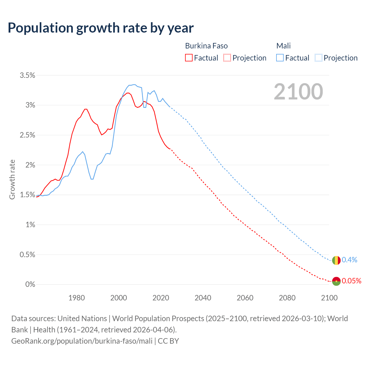 - For the last 10 years, Burkina Faso has had an average growth rate of +2.63% per year vs +3.12% in Mali.