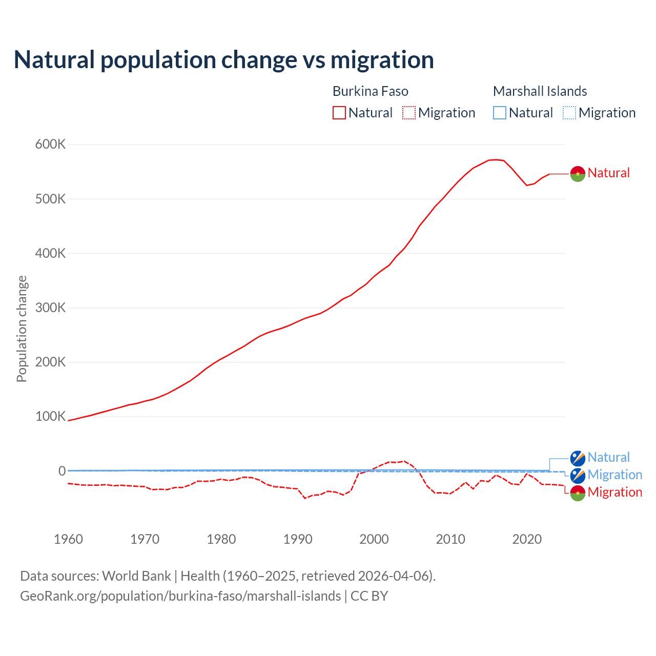 Over the last 10 years, 96.9% of the population change in Burkina Faso is from natural causes (a gain of 5,506,960 people) and 3.13% is from migration (a loss of 177,923 people). In the Marshall Islands 27.8% is from natural causes (a gain of 7,592 people) and 72.2% is from migration (a loss of 19,682 people).
