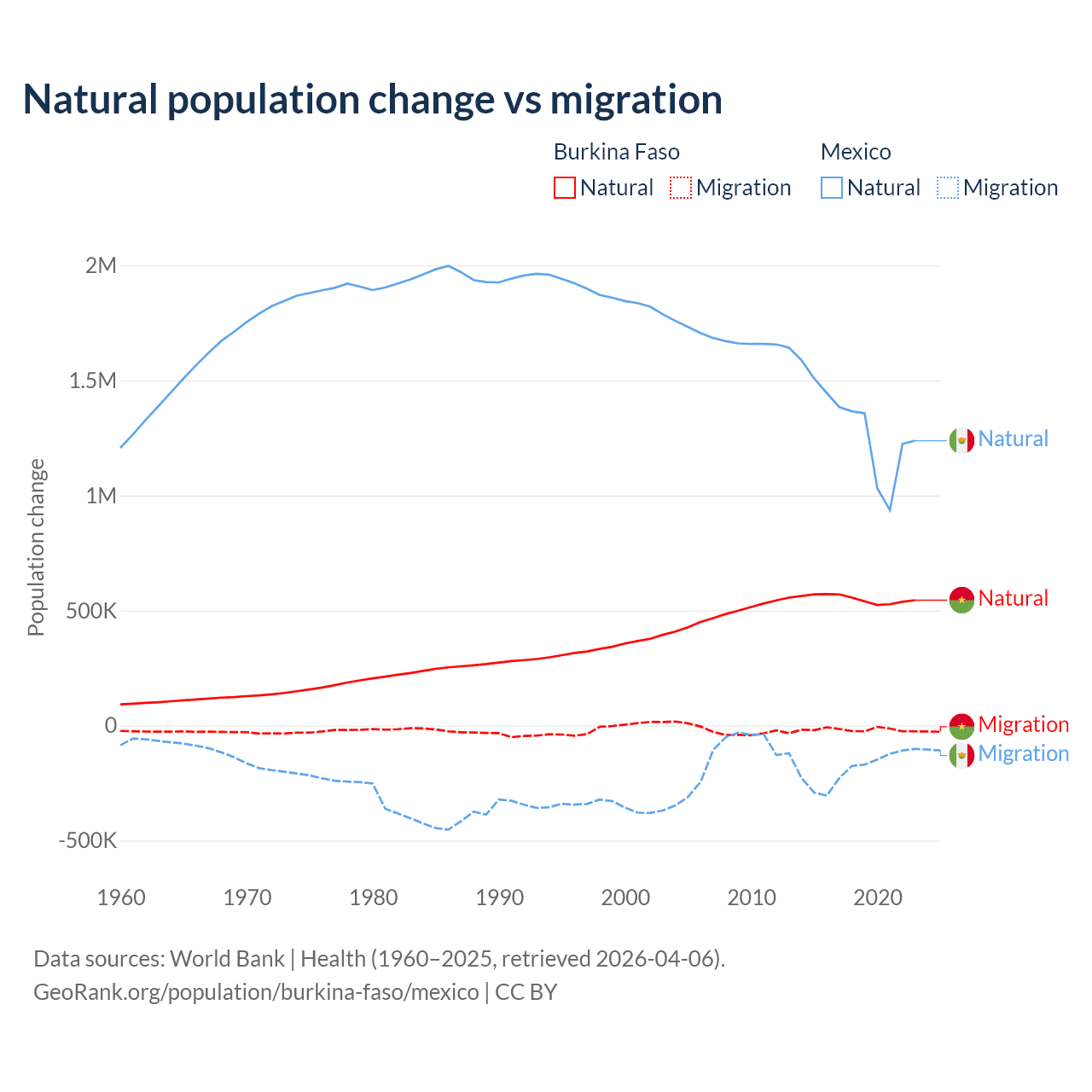 Over the last 10 years, 96.9% of the population change in Burkina Faso is from natural causes (a gain of 5,506,960 people) and 3.13% is from migration (a loss of 177,923 people). In Mexico 87.5% is from natural causes (a gain of 13,080,136 people) and 12.5% is from migration (a loss of 1,876,544 people).