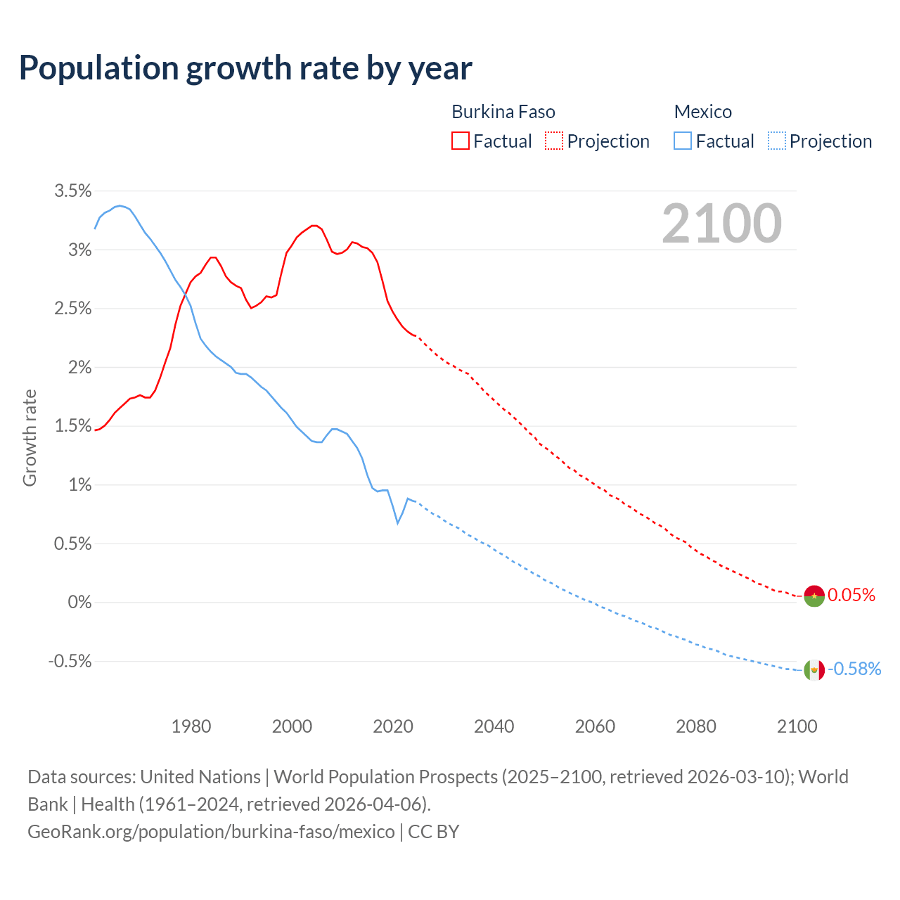 - For the last 10 years, Burkina Faso has had an average growth rate of +2.63% per year vs +0.92% in Mexico.