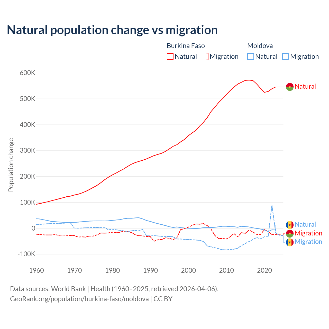 Over the last 10 years, 96.9% of the population change in Burkina Faso is from natural causes (a gain of 5,506,960 people) and 3.13% is from migration (a loss of 177,923 people). In Moldova 6.04% is from natural causes (a loss of 19,001 people) and 94% is from migration (a loss of 295,631 people).