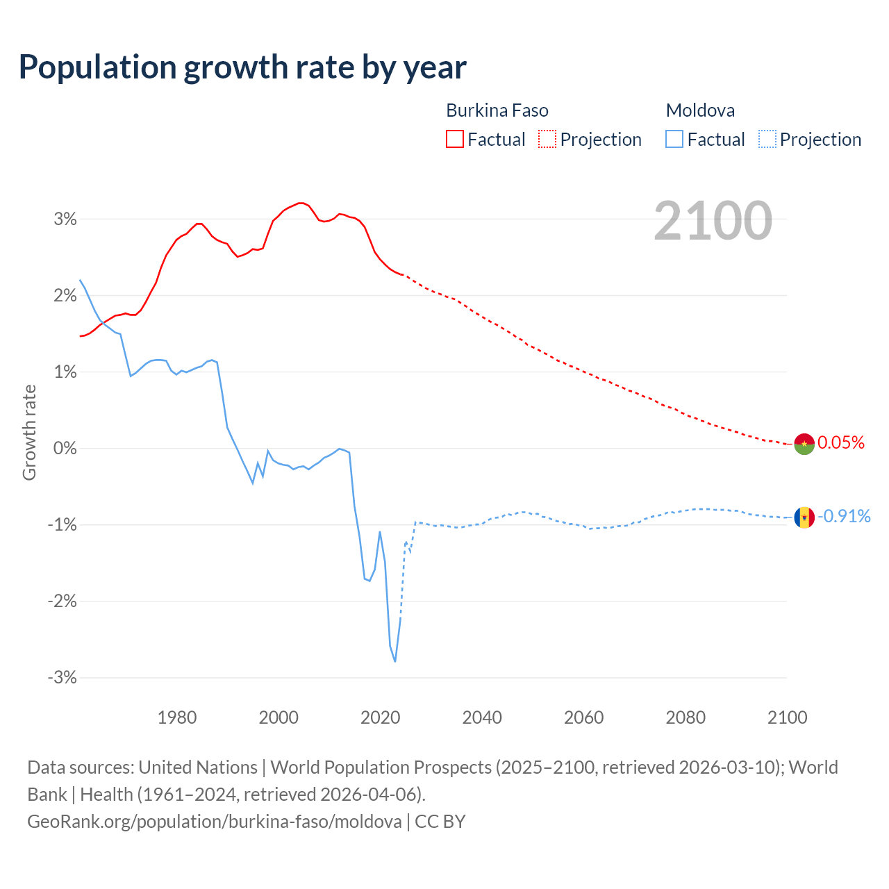 - For the last 10 years, Burkina Faso has had an average growth rate of +2.63% per year vs -1.57% in Moldova.