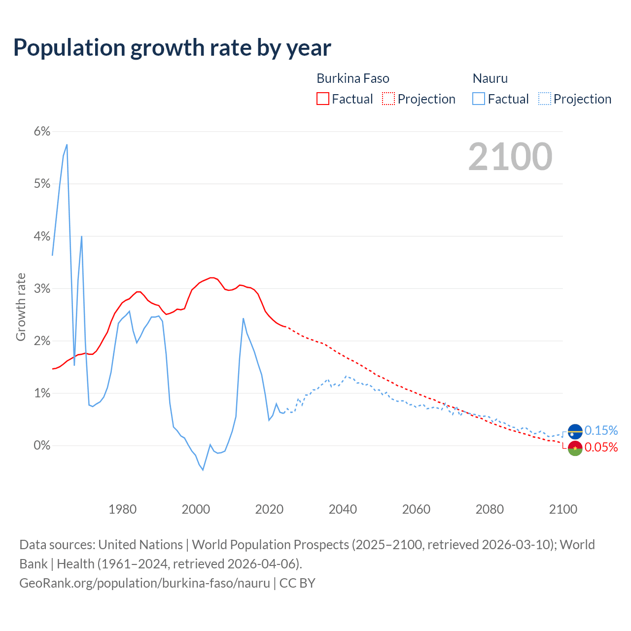 Burkina Faso vs Nauru: population by year and forecast