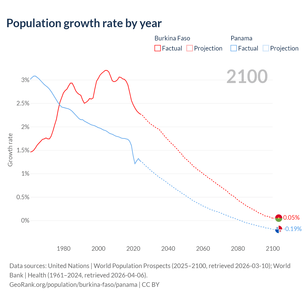 - For the last 10 years, Burkina Faso has had an average growth rate of +2.63% per year vs +1.52% in Panama.