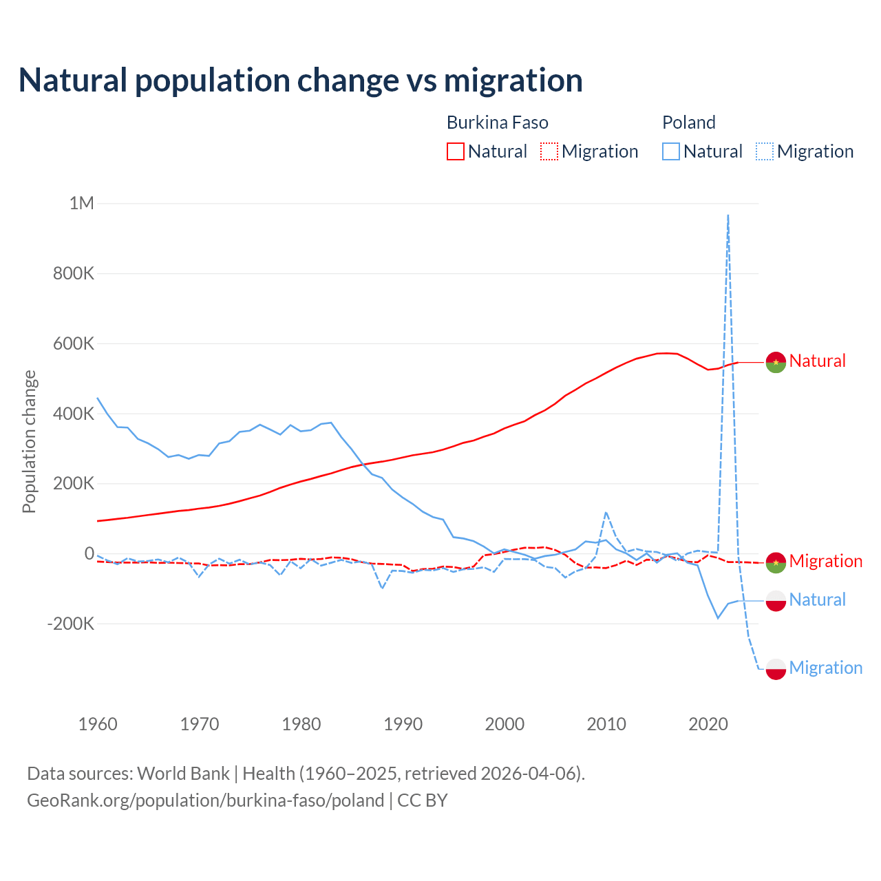 Over the last 10 years, 96.9% of the population change in Burkina Faso is from natural causes (a gain of 5,506,960 people) and 3.13% is from migration (a loss of 177,923 people). In Poland 41.4% is from natural causes (a loss of 675,443 people) and 58.6% is from migration (a gain of 955,766 people).