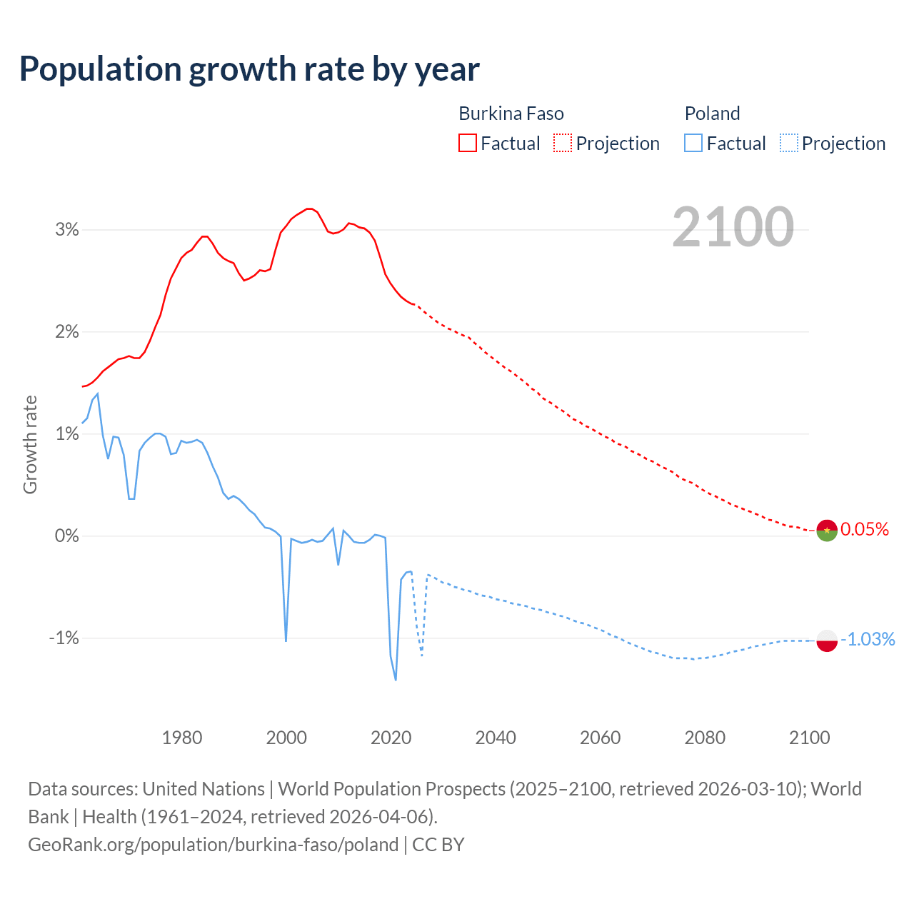 - For the last 10 years, Burkina Faso has had an average growth rate of +2.63% per year vs -0.36% in Poland.
