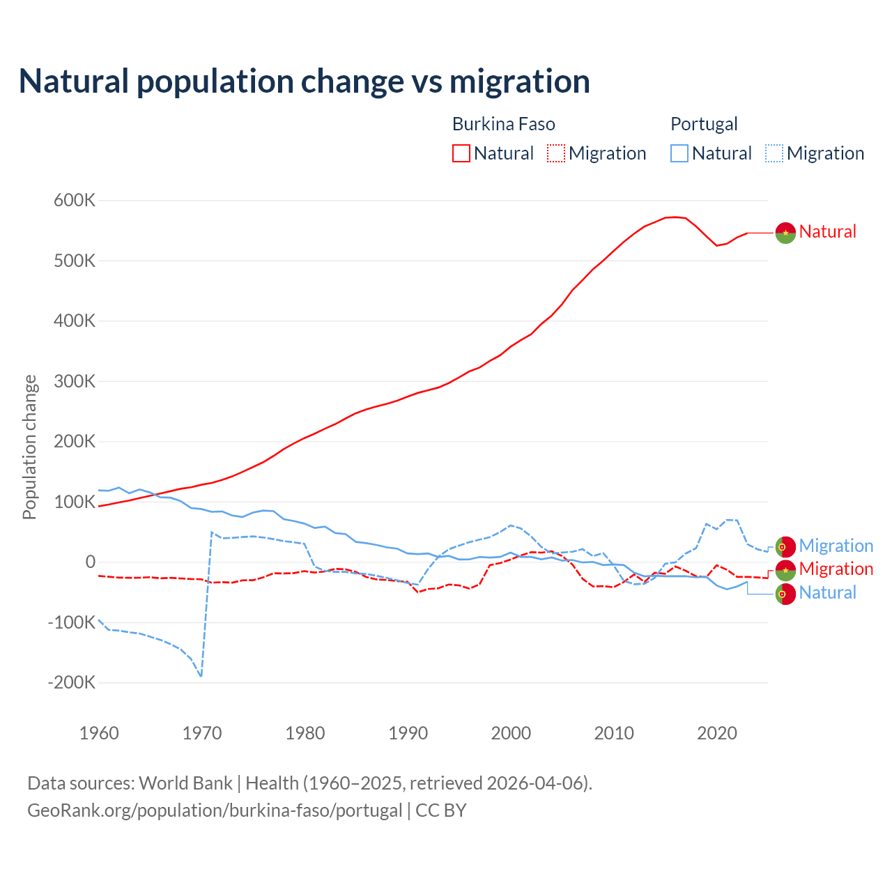 Over the last 10 years, 96.9% of the population change in Burkina Faso is from natural causes (a gain of 5,506,960 people) and 3.13% is from migration (a loss of 177,923 people). In Portugal 51% is from natural causes (a loss of 302,748 people) and 49% is from migration (a gain of 290,554 people).