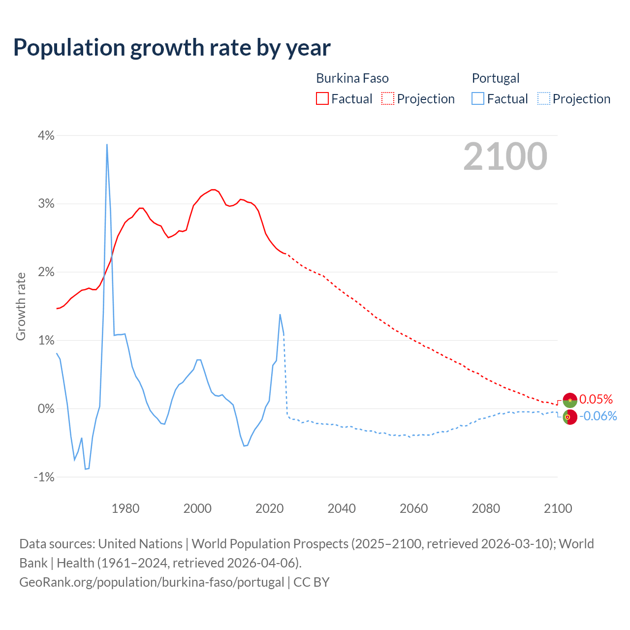 - For the last 10 years, Burkina Faso has had an average growth rate of +2.63% per year vs +0.21% in Portugal.