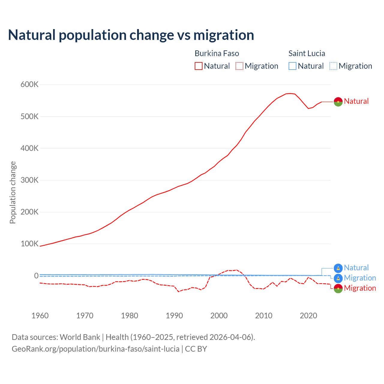 Over the last 10 years, 96.9% of the population change in Burkina Faso is from natural causes (a gain of 5,506,960 people) and 3.13% is from migration (a loss of 177,923 people). In Saint Lucia 95.7% is from natural causes (a gain of 6,039 people) and 4.31% is from migration (a loss of 272 people).