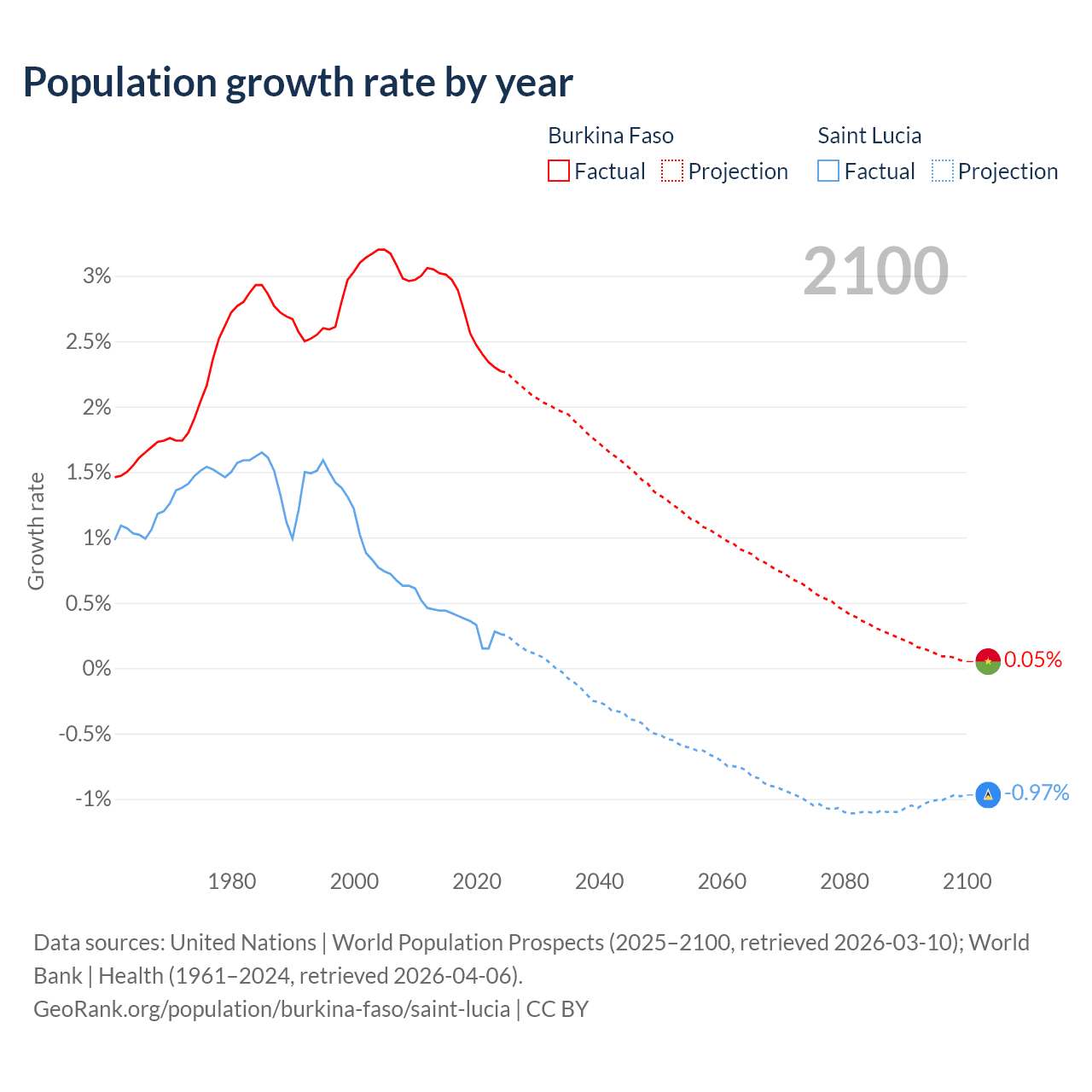 - For the last 10 years, Burkina Faso has had an average growth rate of +2.63% per year vs +0.33% in Saint Lucia.