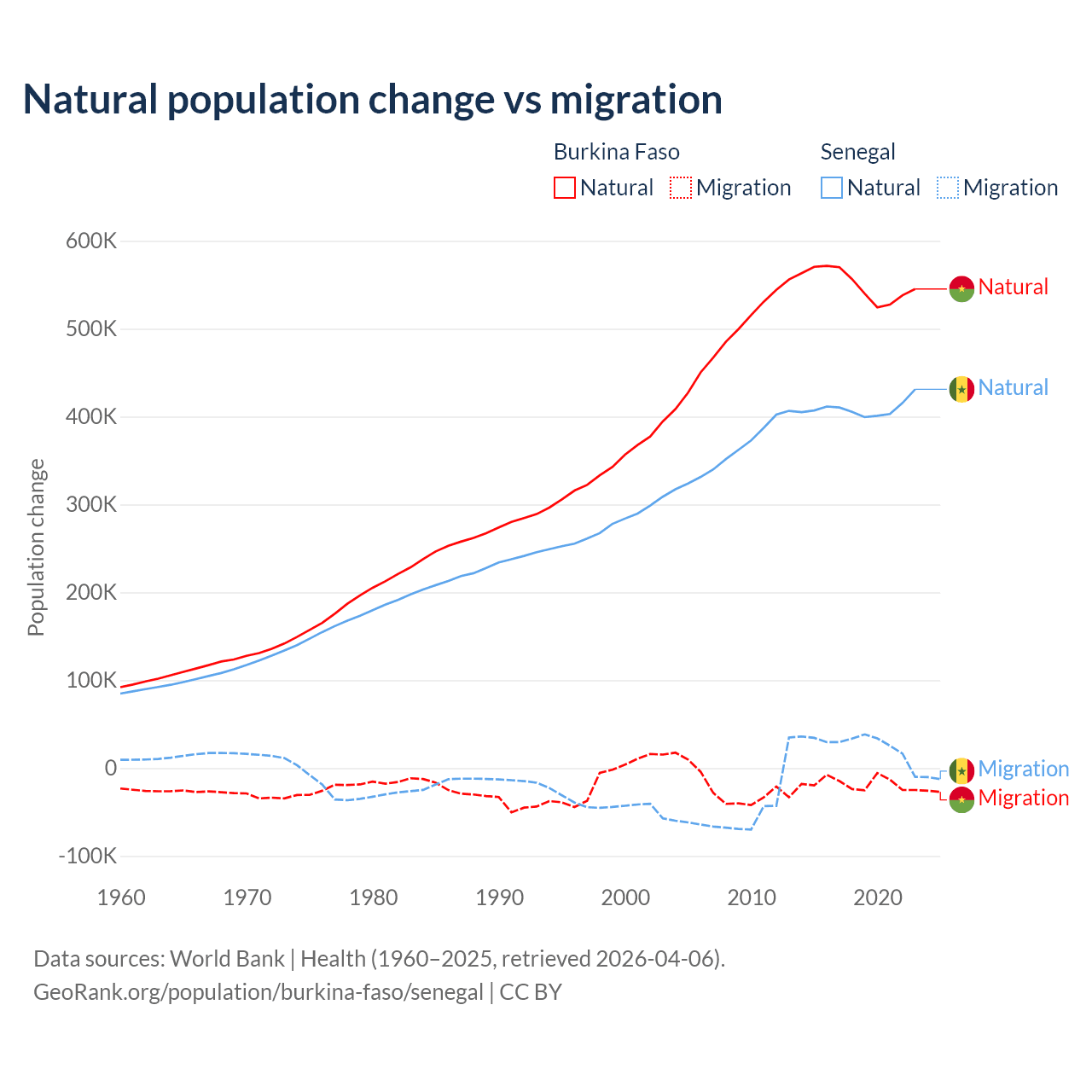 Over the last 10 years, 96.9% of the population change in Burkina Faso is from natural causes (a gain of 5,506,960 people) and 3.13% is from migration (a loss of 177,923 people). In Senegal 93.9% is from natural causes (a gain of 4,089,205 people) and 6.13% is from migration (a gain of 267,266 people).