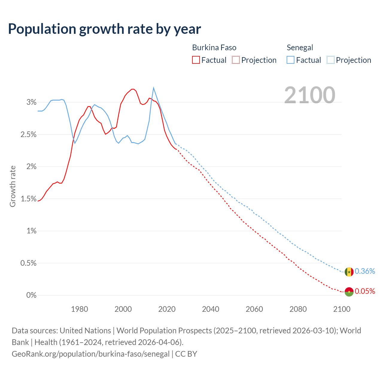 - For the last 10 years, Burkina Faso has had an average growth rate of +2.63% per year vs +2.76% in Senegal.