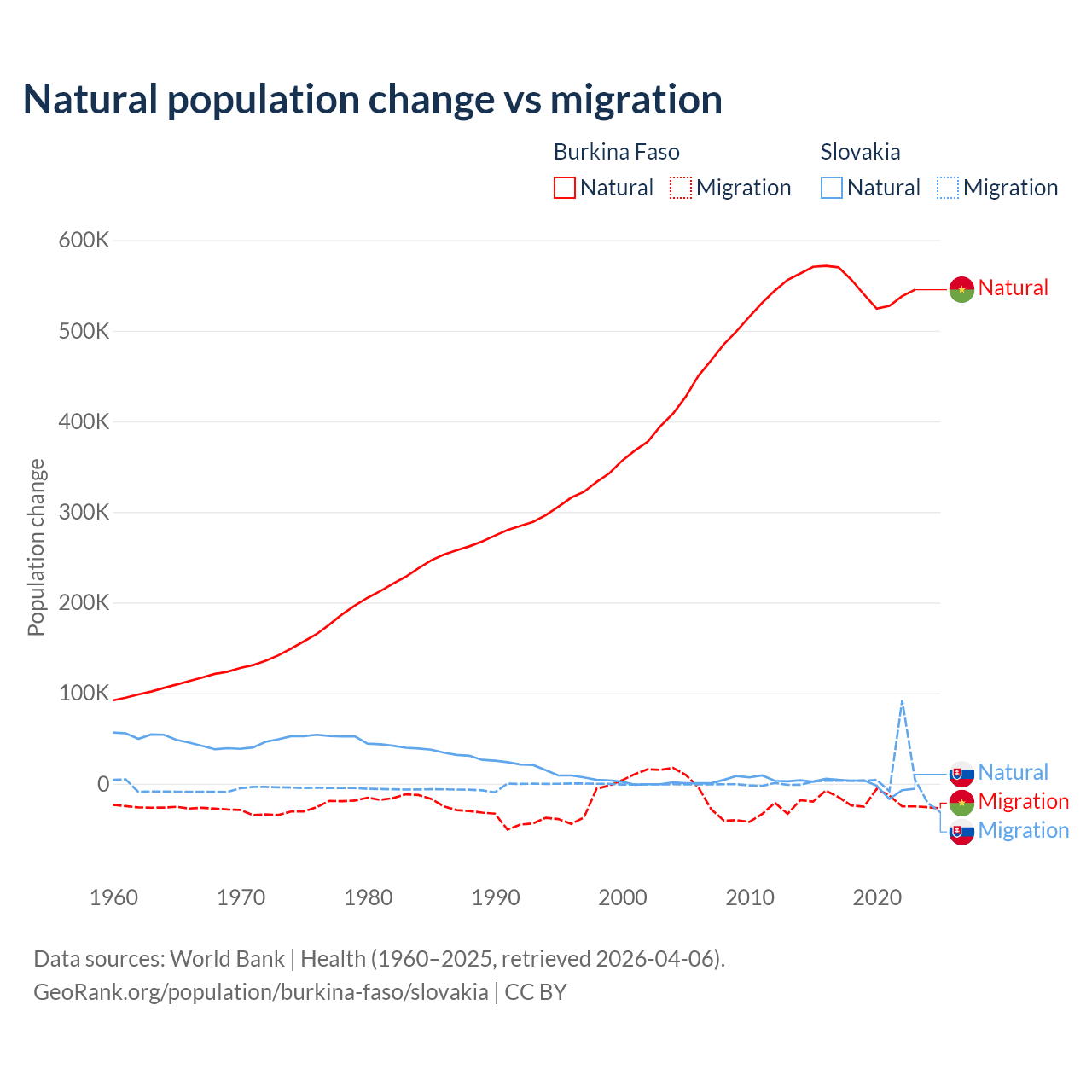Over the last 10 years, 96.9% of the population change in Burkina Faso is from natural causes (a gain of 5,506,960 people) and 3.13% is from migration (a loss of 177,923 people). In Slovakia 7.47% is from natural causes (a loss of 8,728 people) and 92.5% is from migration (a gain of 108,156 people).