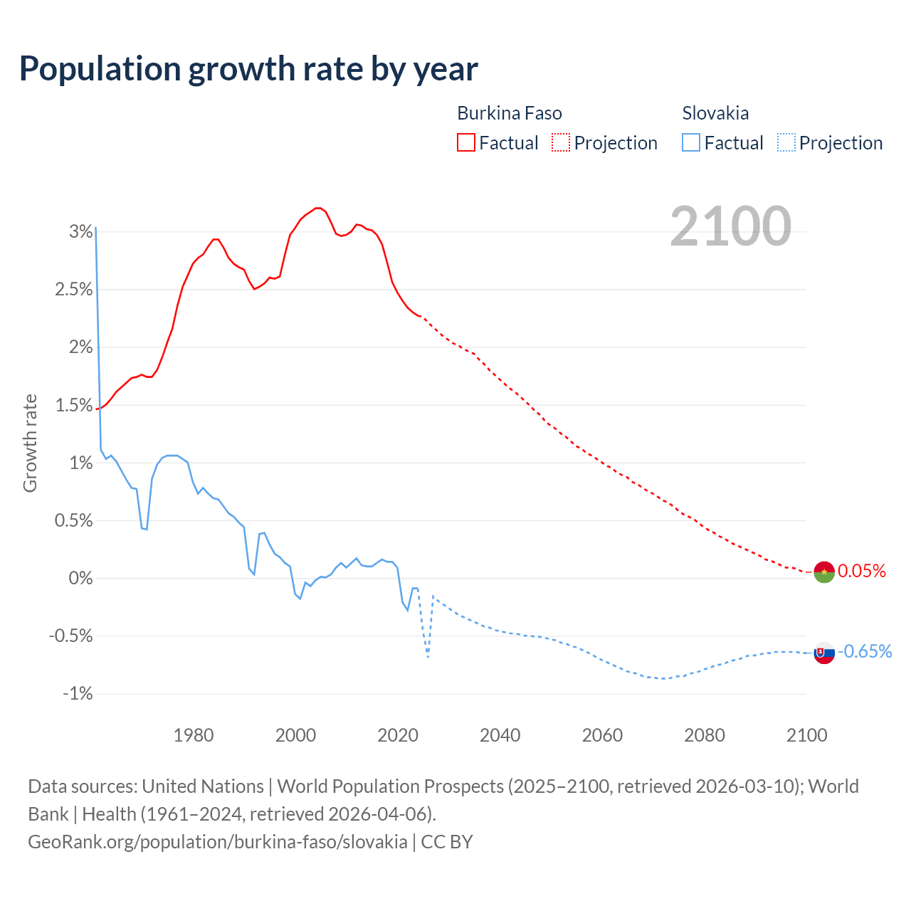 - For the last 10 years, Burkina Faso has had an average growth rate of +2.63% per year vs +0.01% in Slovakia.