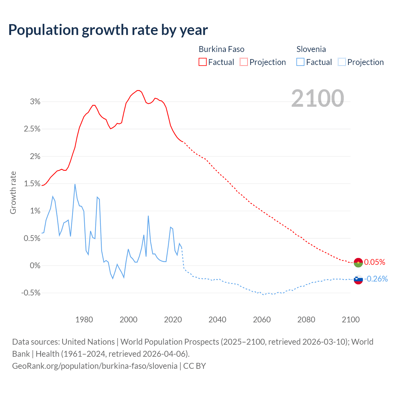 - For the last 10 years, Burkina Faso has had an average growth rate of +2.63% per year vs +0.29% in Slovenia.