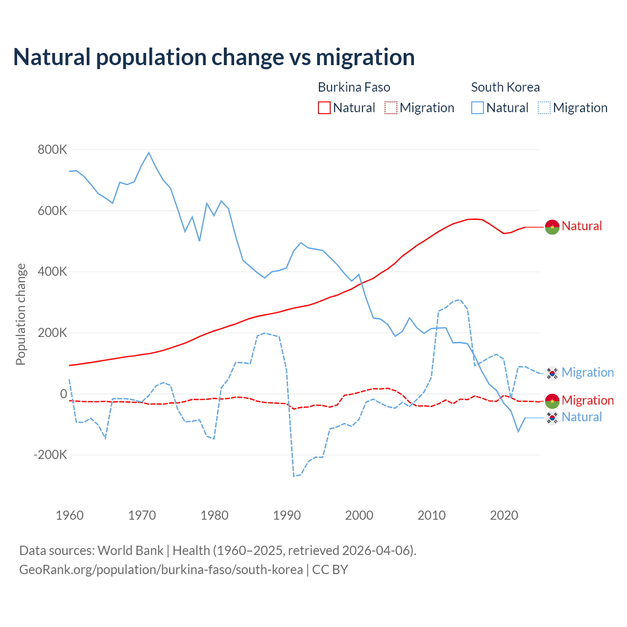 Over the last 10 years, 96.9% of the population change in Burkina Faso is from natural causes (a gain of 5,506,960 people) and 3.13% is from migration (a loss of 177,923 people). In South Korea 17.6% is from natural causes (a gain of 277,215 people) and 82.4% is from migration (a gain of 1,298,356 people).