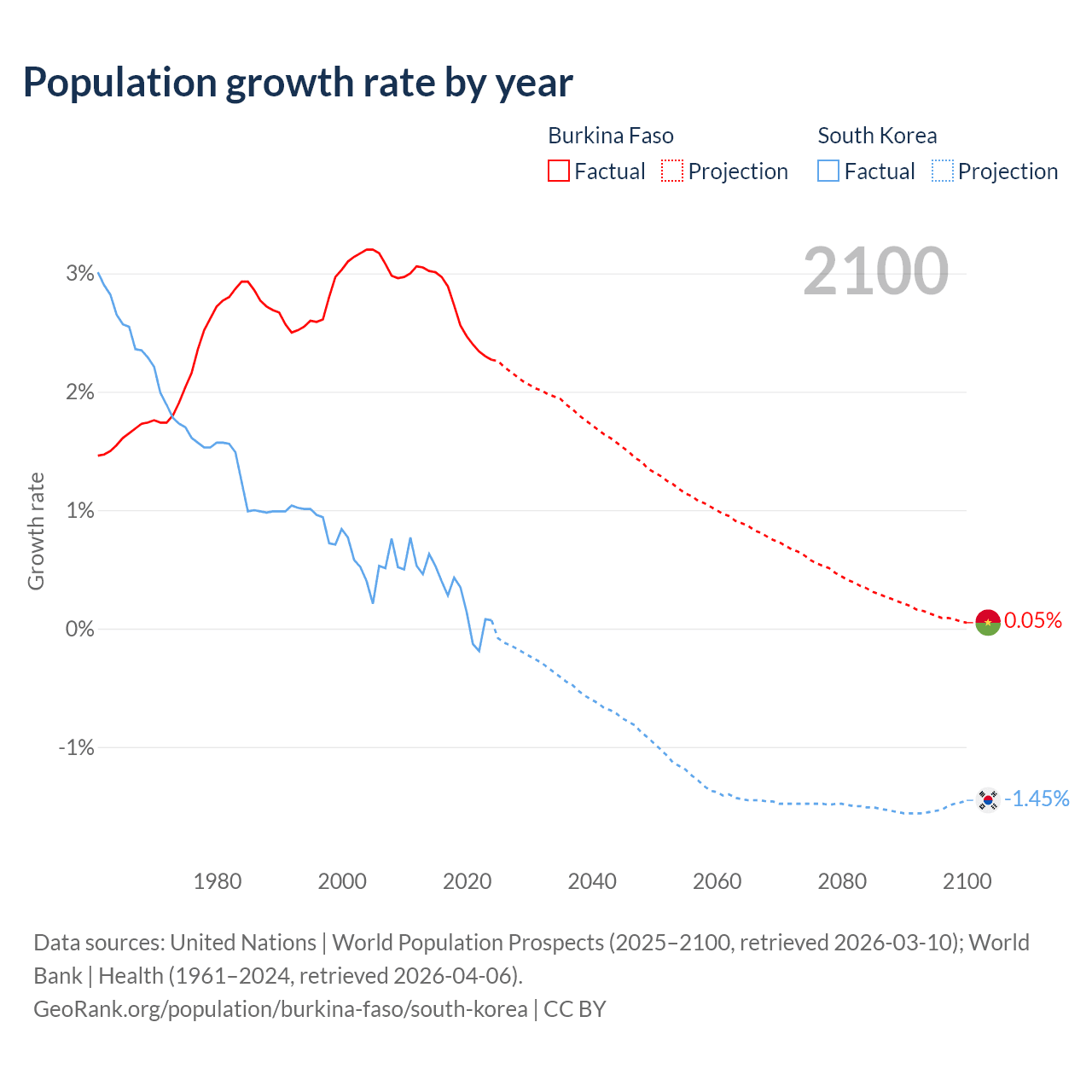 - For the last 10 years, Burkina Faso has had an average growth rate of +2.63% per year vs +0.24% in South Korea.