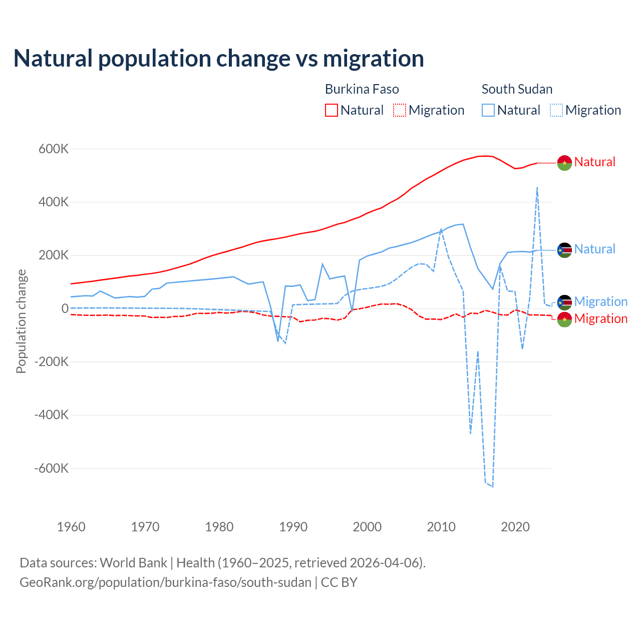 Over the last 10 years, 96.9% of the population change in Burkina Faso is from natural causes (a gain of 5,506,960 people) and 3.13% is from migration (a loss of 177,923 people). In South Sudan 57.4% is from natural causes (a gain of 1,792,135 people) and 42.6% is from migration (a loss of 1,329,606 people).