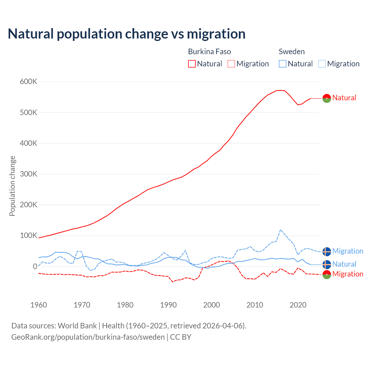 Over the last 10 years, 96.9% of the population change in Burkina Faso is from natural causes (a gain of 5,506,960 people) and 3.13% is from migration (a loss of 177,923 people). In Sweden 21.4% is from natural causes (a gain of 201,900 people) and 78.6% is from migration (a gain of 743,642 people).