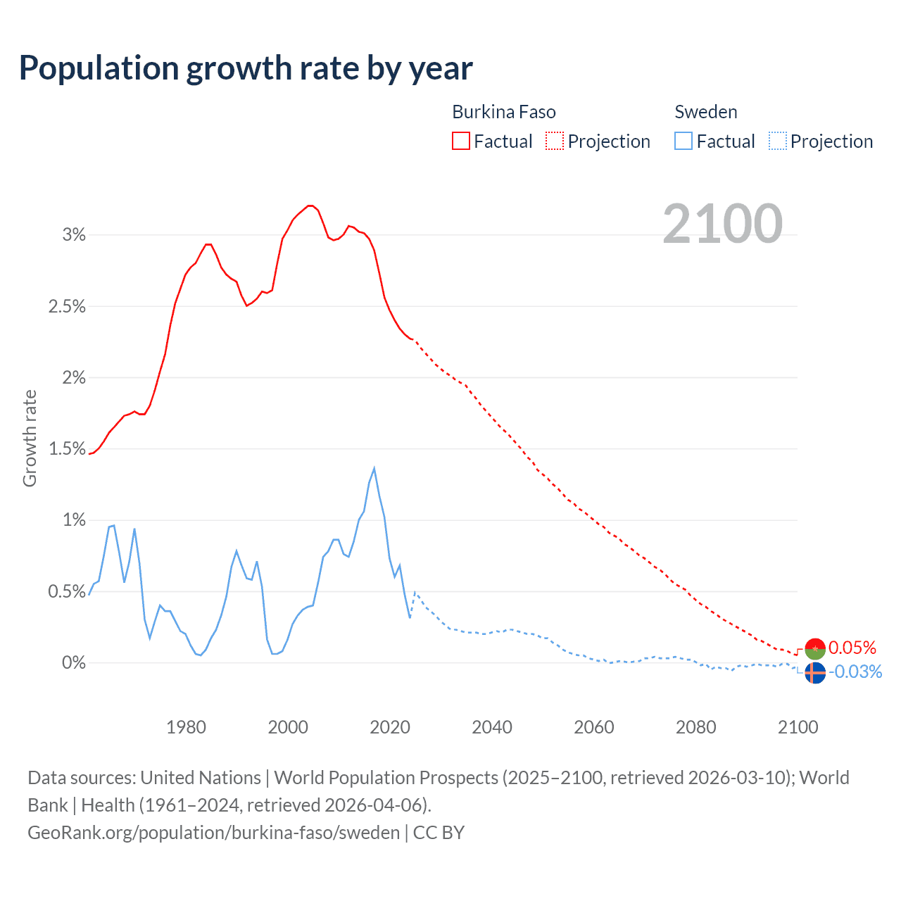 - For the last 10 years, Burkina Faso has had an average growth rate of +2.63% per year vs +0.88% in Sweden.