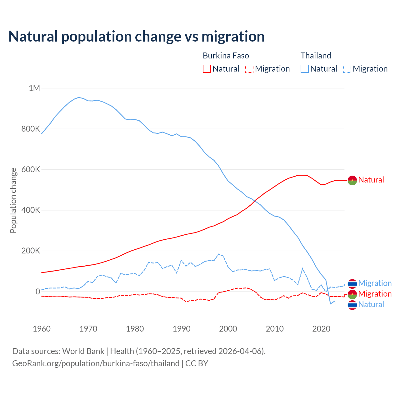 Over the last 10 years, 96.9% of the population change in Burkina Faso is from natural causes (a gain of 5,506,960 people) and 3.13% is from migration (a loss of 177,923 people). In Thailand 78.4% is from natural causes (a gain of 1,292,528 people) and 21.6% is from migration (a gain of 355,361 people).