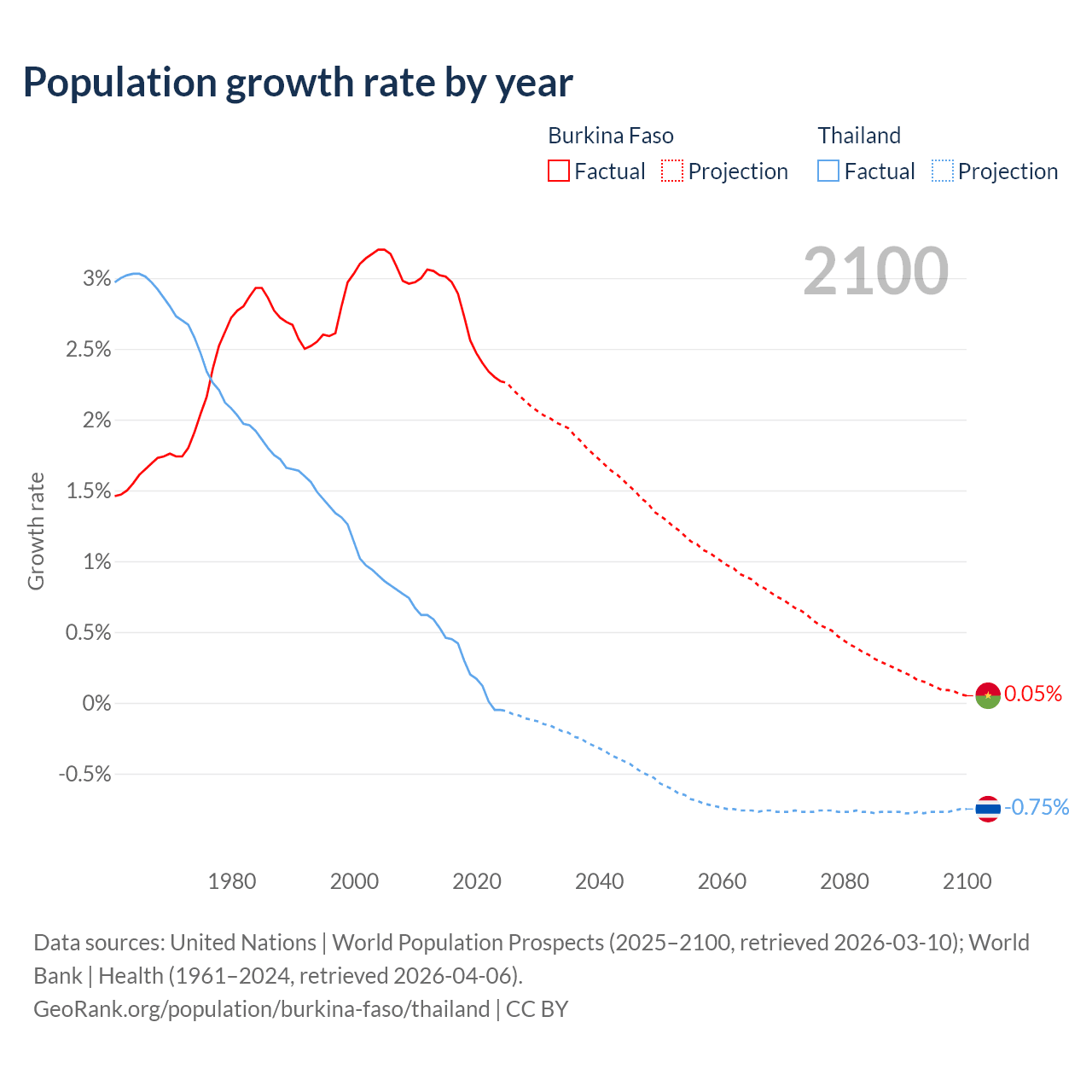 - For the last 10 years, Burkina Faso has had an average growth rate of +2.63% per year vs +0.23% in Thailand.