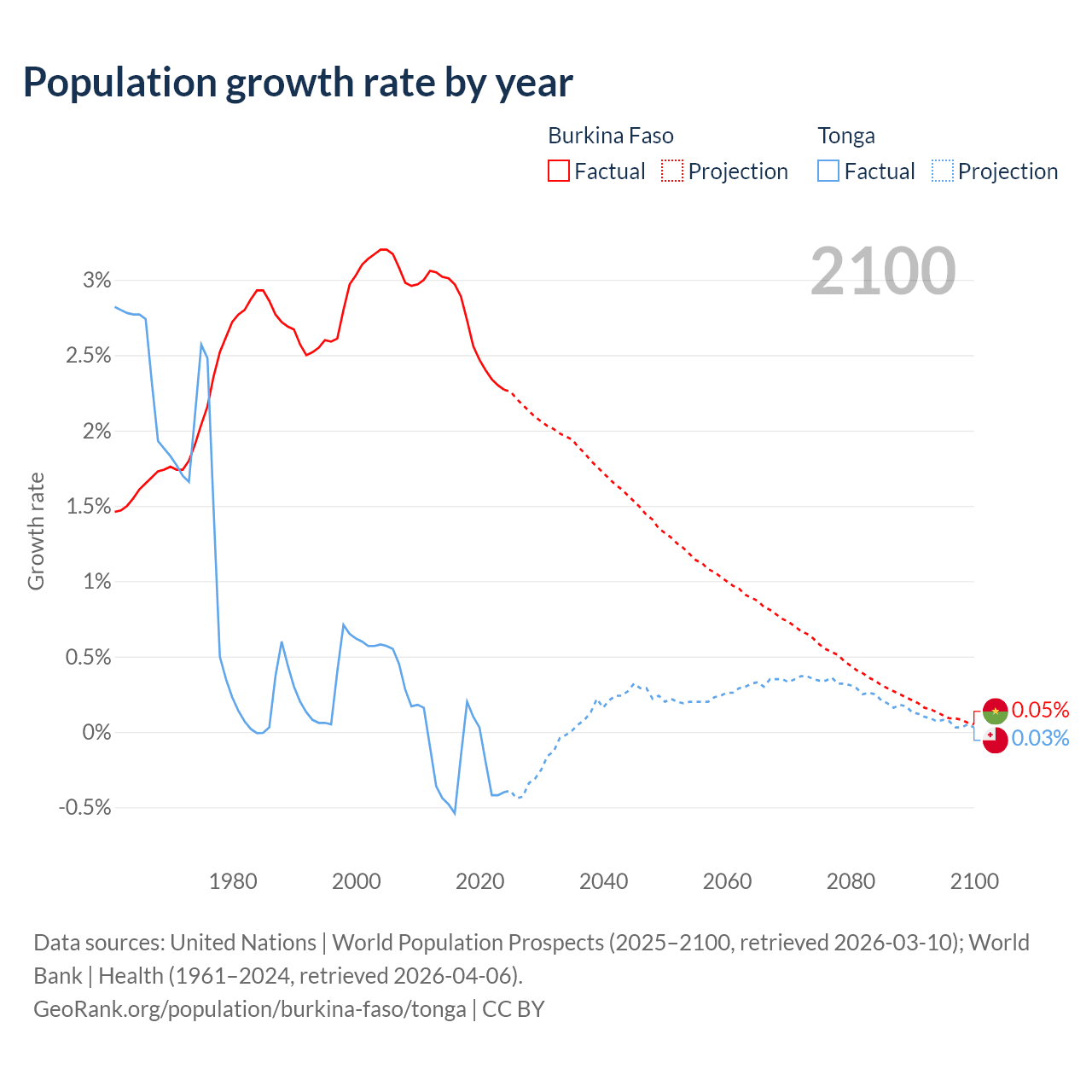 - For the last 10 years, Burkina Faso has had an average growth rate of +2.63% per year vs -0.25% in Tonga.