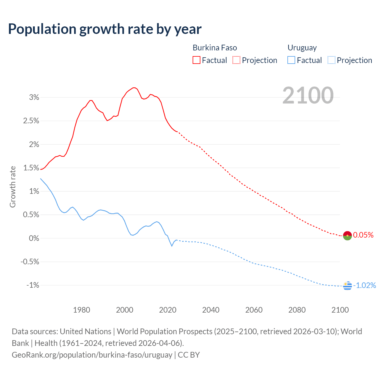 Burkina Faso vs Uruguay: population by year and forecast