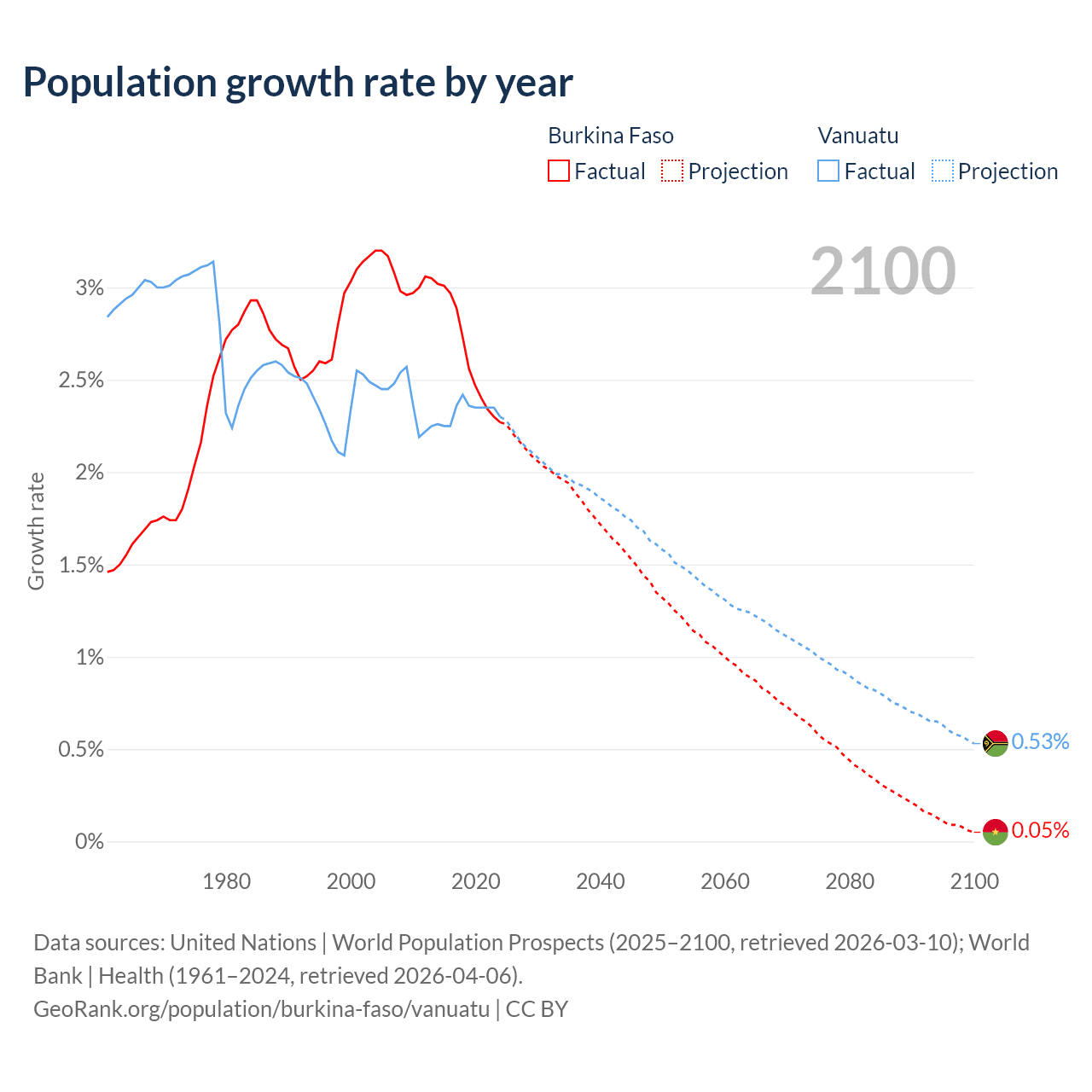 - For the last 10 years, Burkina Faso has had an average growth rate of +2.63% per year vs +2.33% in Vanuatu.