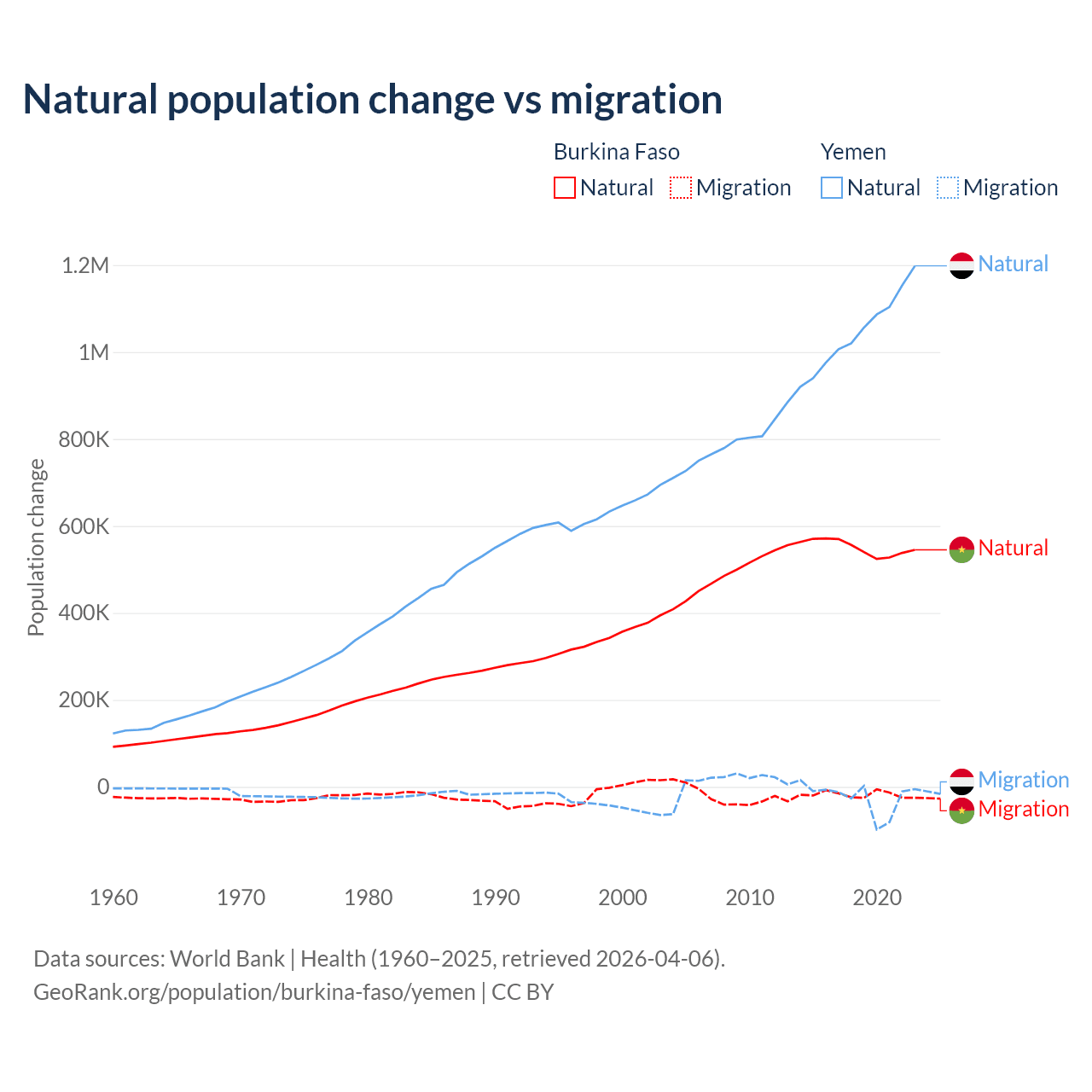 Over the last 10 years, 96.9% of the population change in Burkina Faso is from natural causes (a gain of 5,506,960 people) and 3.13% is from migration (a loss of 177,923 people). In Yemen 97.8% is from natural causes (a gain of 10,460,813 people) and 2.17% is from migration (a loss of 231,814 people).