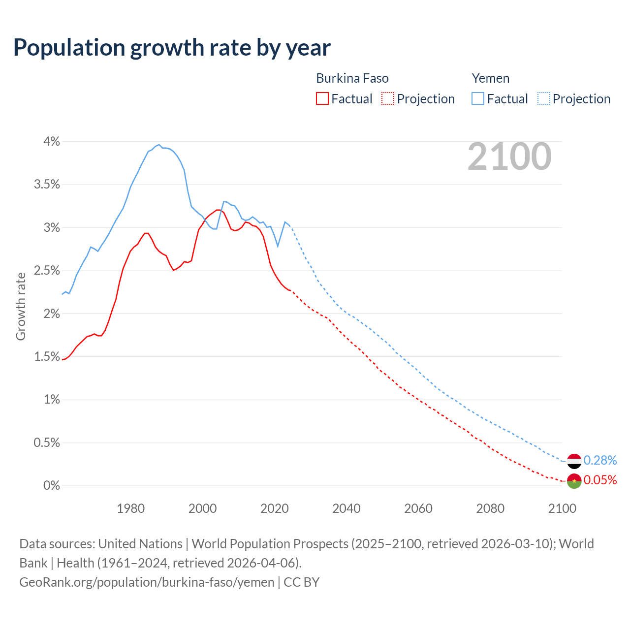 - For the last 10 years, Burkina Faso has had an average growth rate of +2.63% per year vs +3% in Yemen.