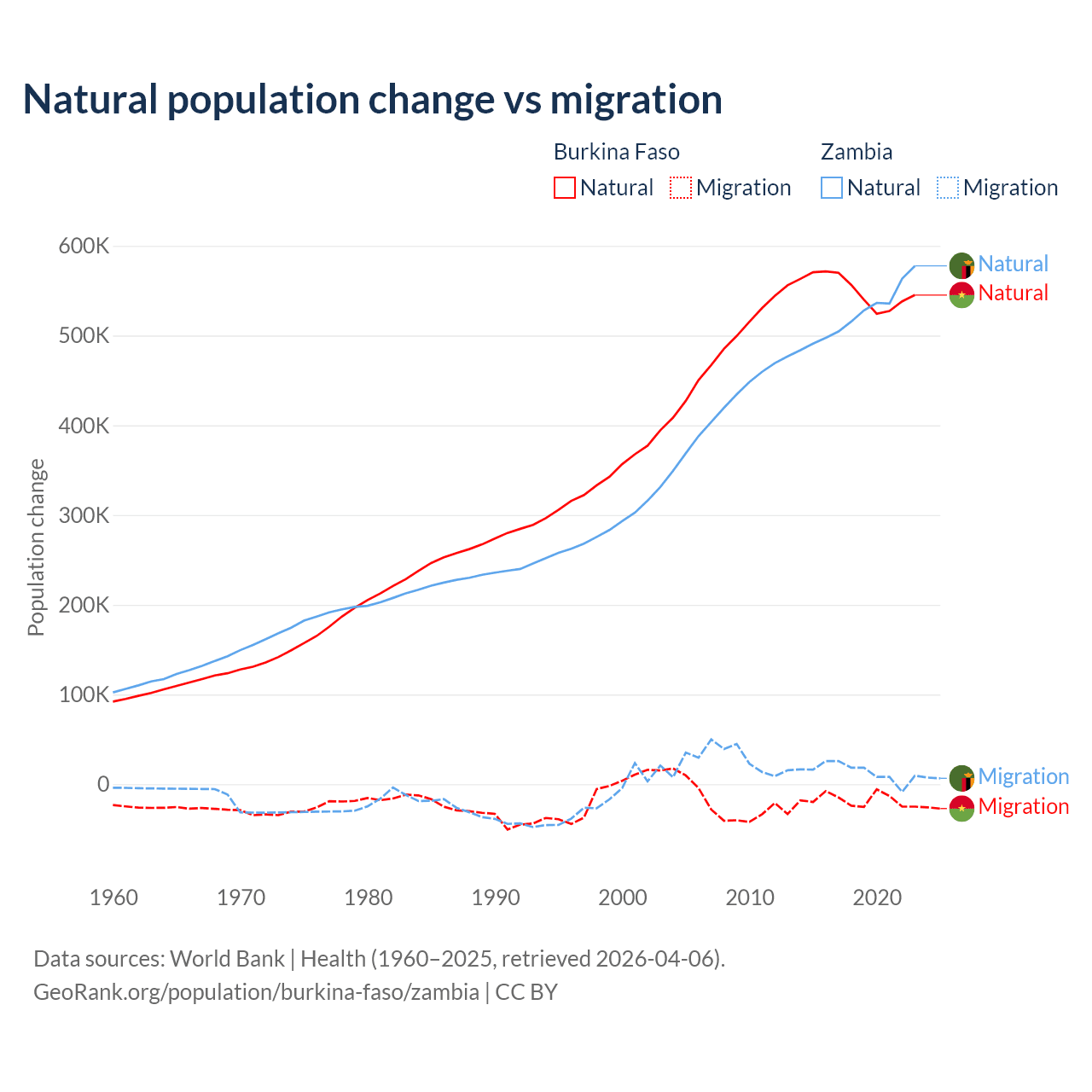 Over the last 10 years, 96.9% of the population change in Burkina Faso is from natural causes (a gain of 5,506,960 people) and 3.13% is from migration (a loss of 177,923 people). In Zambia 97.4% is from natural causes (a gain of 5,233,797 people) and 2.58% is from migration (a gain of 138,554 people).