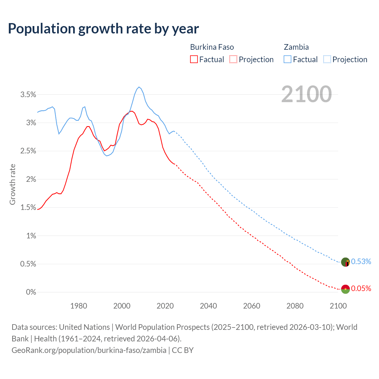- For the last 10 years, Burkina Faso has had an average growth rate of +2.63% per year vs +3% in Zambia.