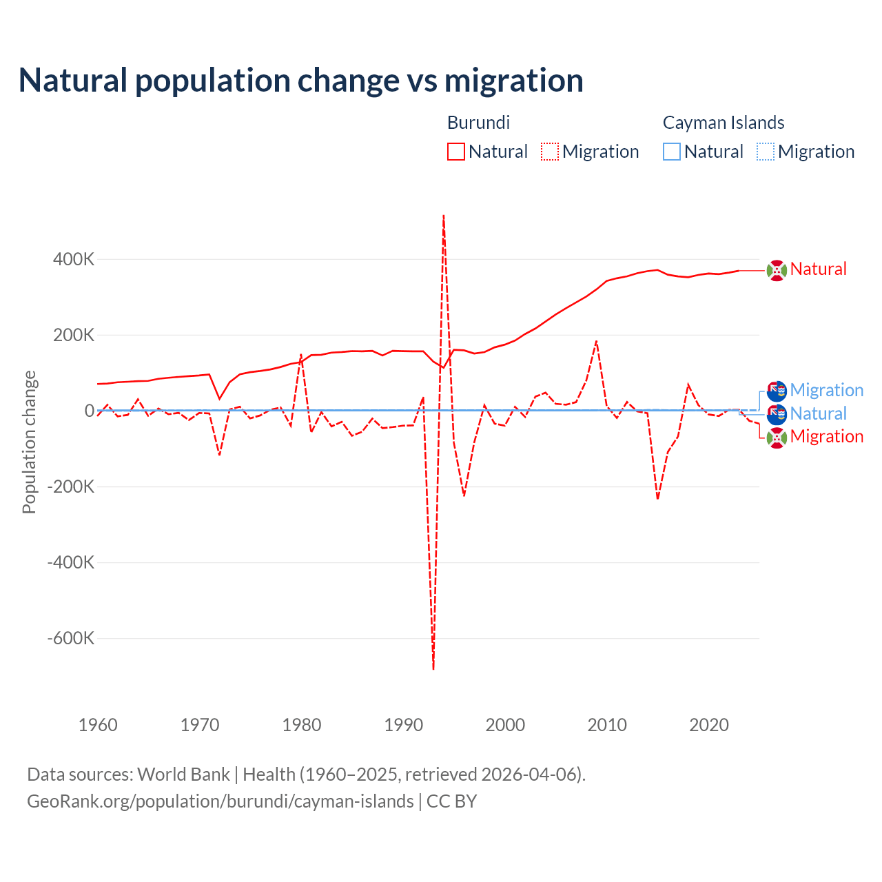 Over the last 10 years, 91% of the population change in Burundi is from natural causes (a gain of 3,614,502 people) and 9.03% is from migration (a loss of 358,928 people). In the Cayman Islands 31.1% is from natural causes (a gain of 4,468 people) and 68.9% is from migration (a gain of 9,879 people).