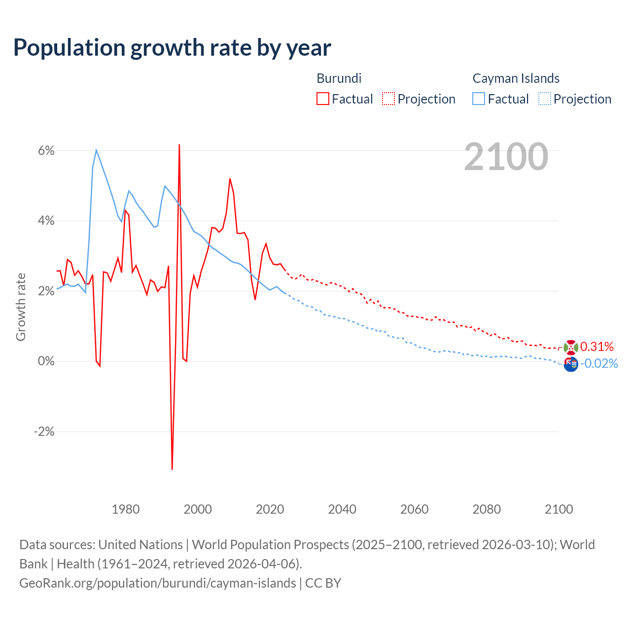 - For the last 10 years, Burundi has had an average growth rate of +2.74% per year vs +2.19% in the Cayman Islands.