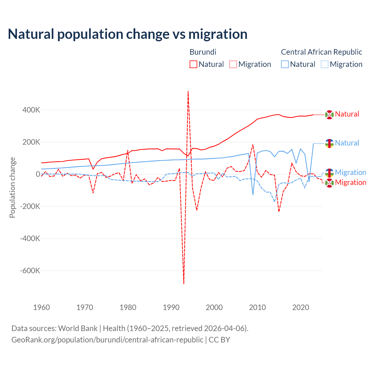 Over the last 10 years, 91% of the population change in Burundi is from natural causes (a gain of 3,614,502 people) and 9.03% is from migration (a loss of 358,928 people). In the Central African Republic 66.7% is from natural causes (a gain of 1,164,312 people) and 33.3% is from migration (a loss of 580,593 people).