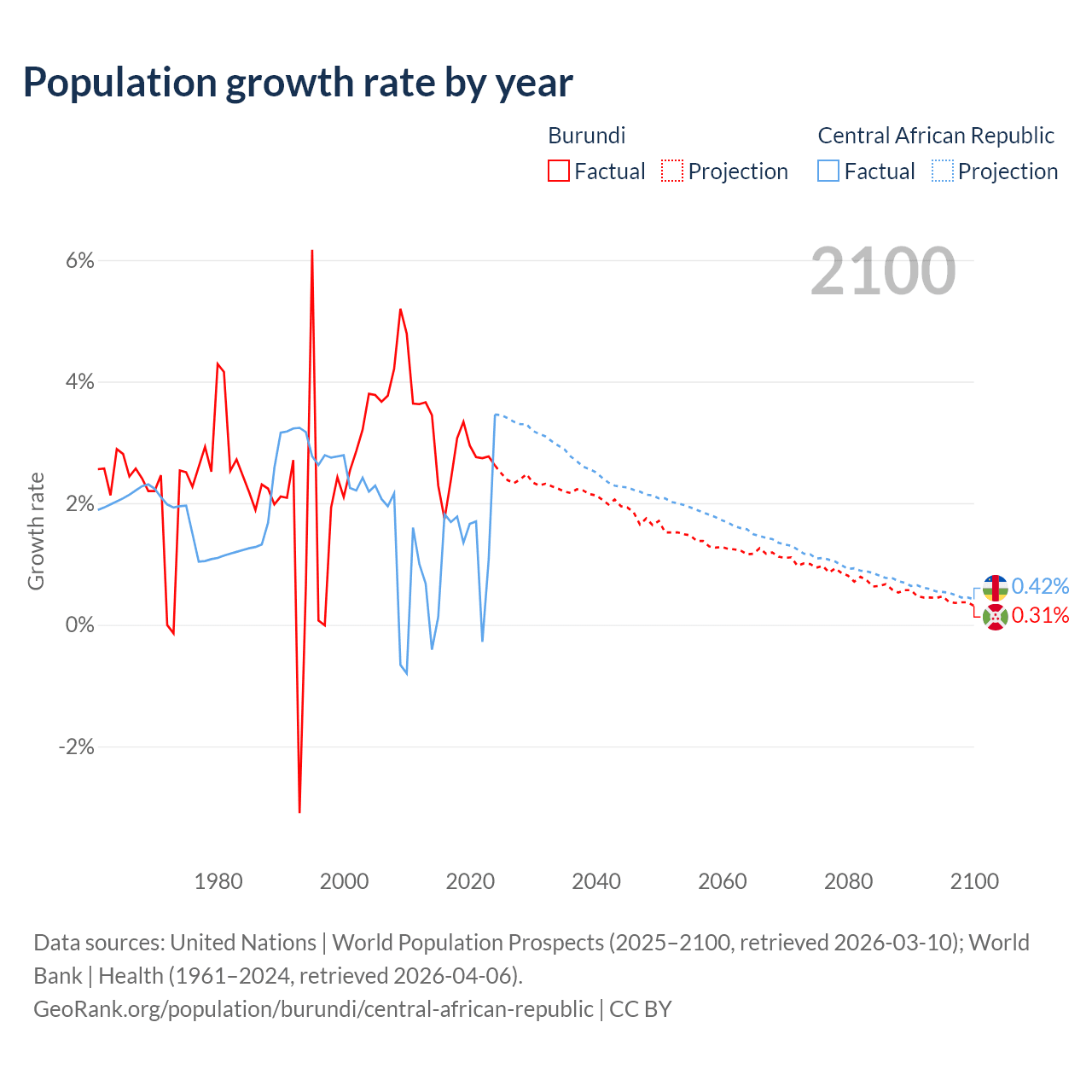- For the last 10 years, Burundi has had an average growth rate of +2.74% per year vs +1.27% in the Central African Republic.