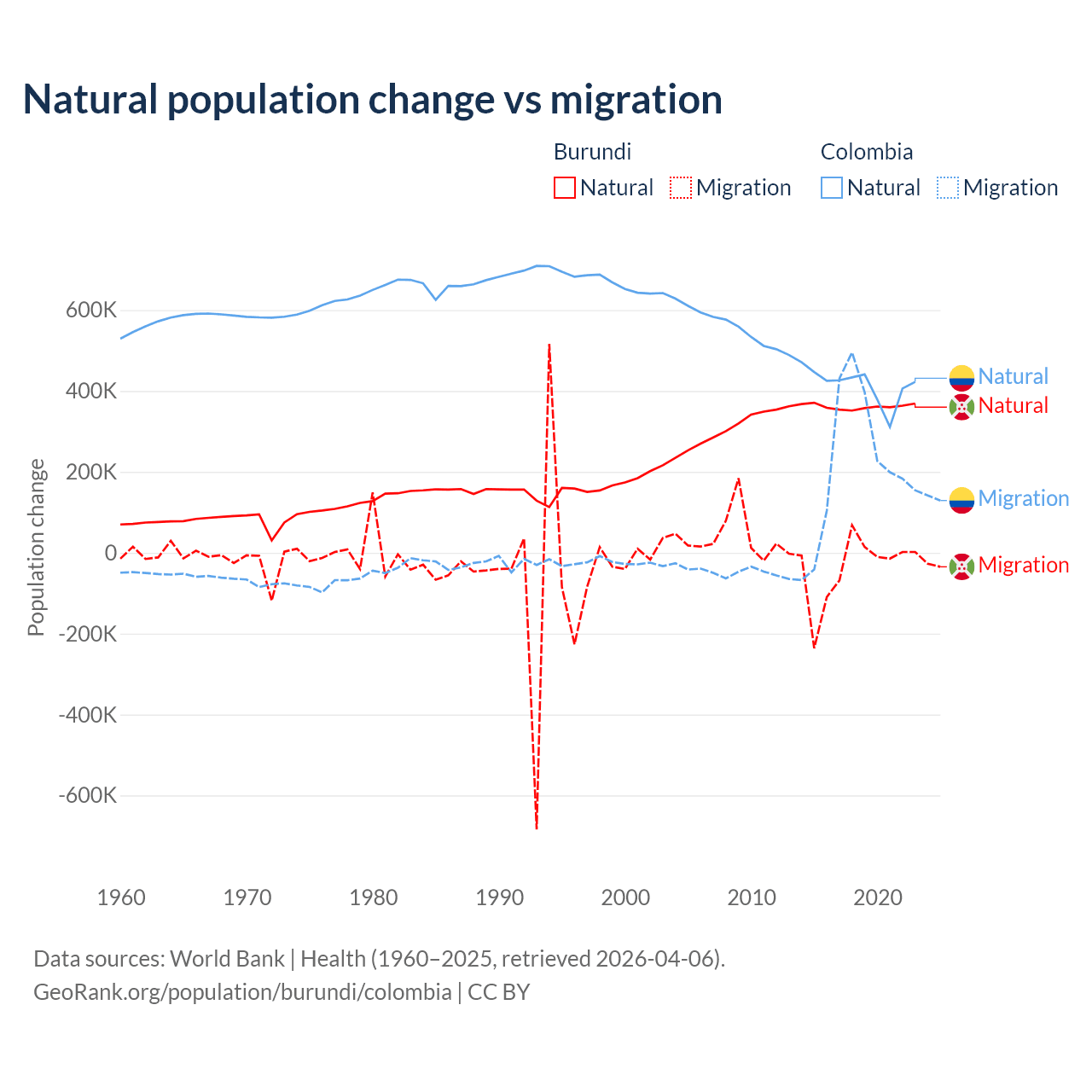 Over the last 10 years, 91% of the population change in Burundi is from natural causes (a gain of 3,614,502 people) and 9.03% is from migration (a loss of 358,928 people). In Colombia 66.6% is from natural causes (a gain of 4,162,856 people) and 33.4% is from migration (a gain of 2,083,051 people).