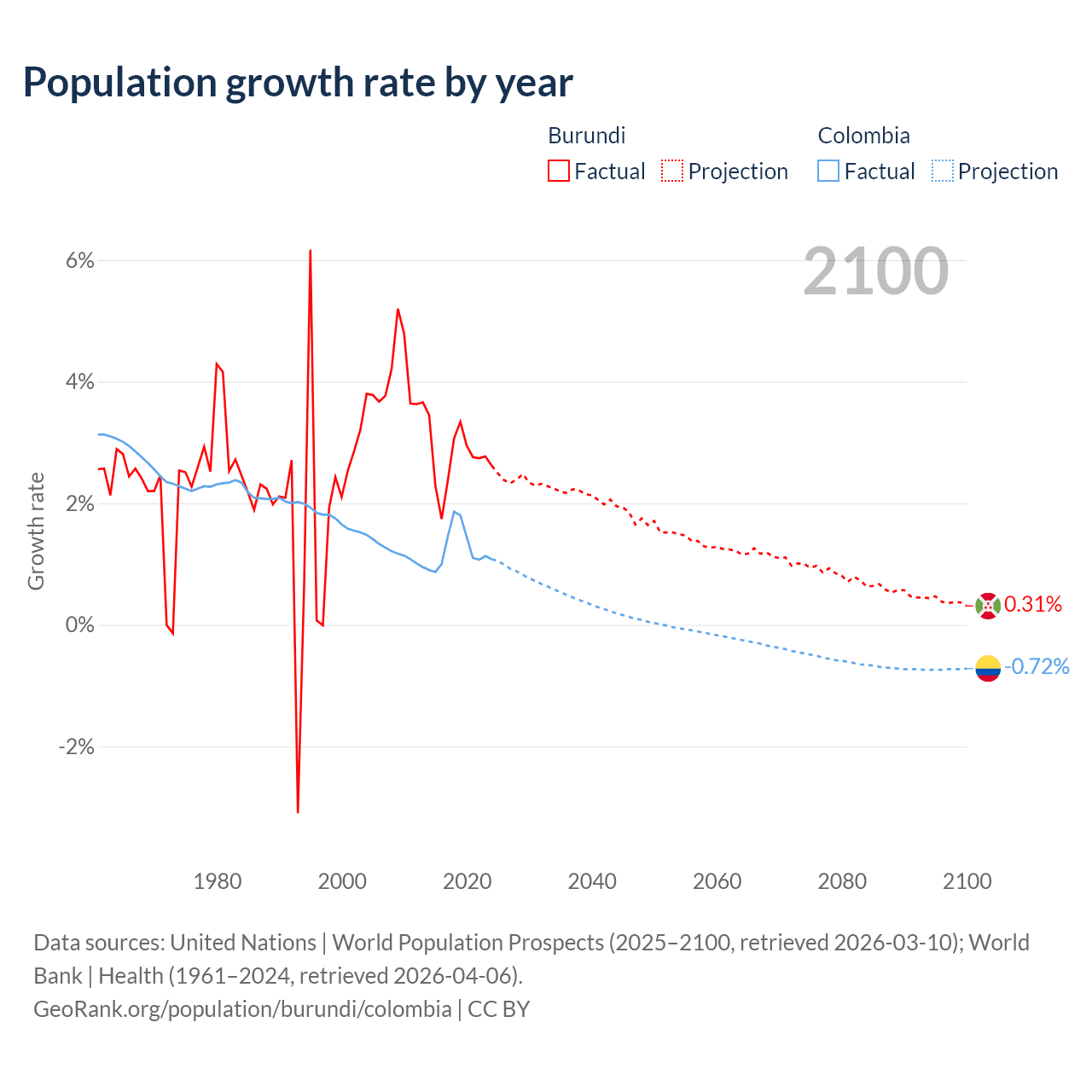 - For the last 10 years, Burundi has had an average growth rate of +2.74% per year vs +1.25% in Colombia.