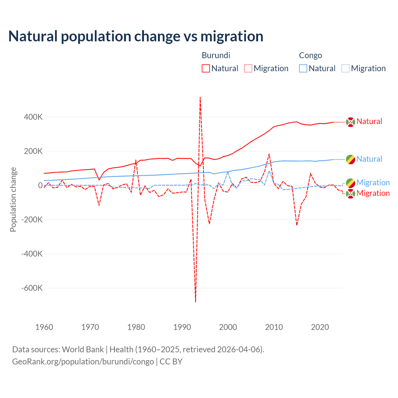 Over the last 10 years, 91% of the population change in Burundi is from natural causes (a gain of 3,614,502 people) and 9.03% is from migration (a loss of 358,928 people). In the Congo 94% is from natural causes (a gain of 1,434,056 people) and 6.04% is from migration (a loss of 92,251 people).