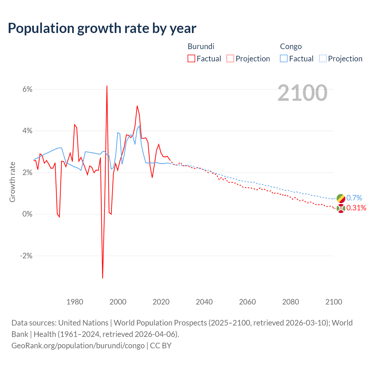 - For the last 10 years, Burundi has had an average growth rate of +2.74% per year vs +2.44% in the Congo.