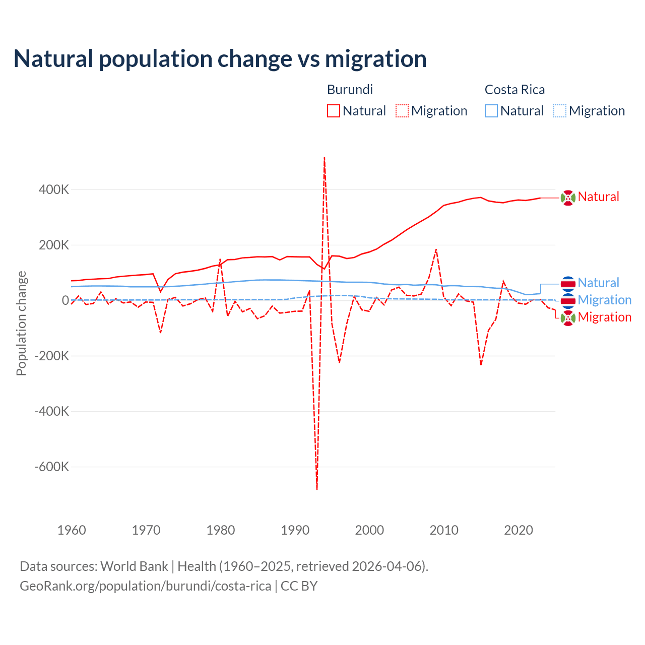 Over the last 10 years, 91% of the population change in Burundi is from natural causes (a gain of 3,614,502 people) and 9.03% is from migration (a loss of 358,928 people). In Costa Rica 96.3% is from natural causes (a gain of 362,624 people) and 3.69% is from migration (a gain of 13,900 people).