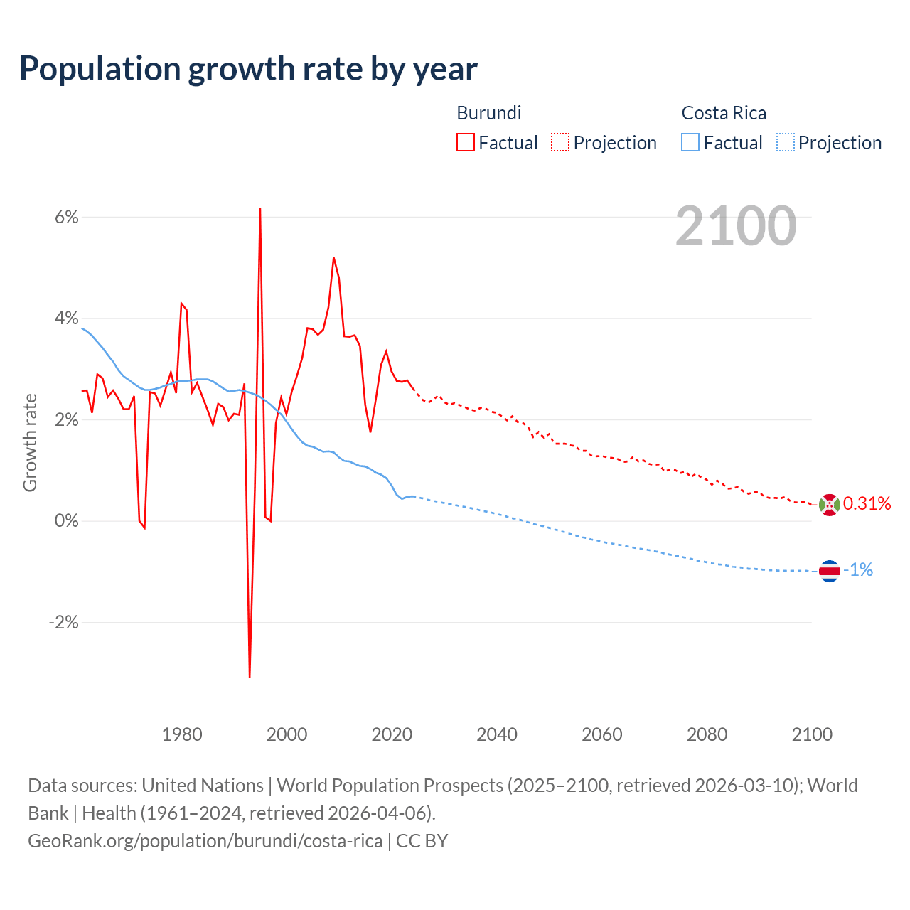 - For the last 10 years, Burundi has had an average growth rate of +2.74% per year vs +0.77% in Costa Rica.