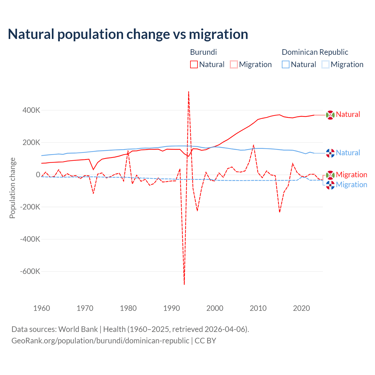 Over the last 10 years, 91% of the population change in Burundi is from natural causes (a gain of 3,614,502 people) and 9.03% is from migration (a loss of 358,928 people). In the Dominican Republic 81.8% is from natural causes (a gain of 1,447,764 people) and 18.2% is from migration (a loss of 322,919 people).