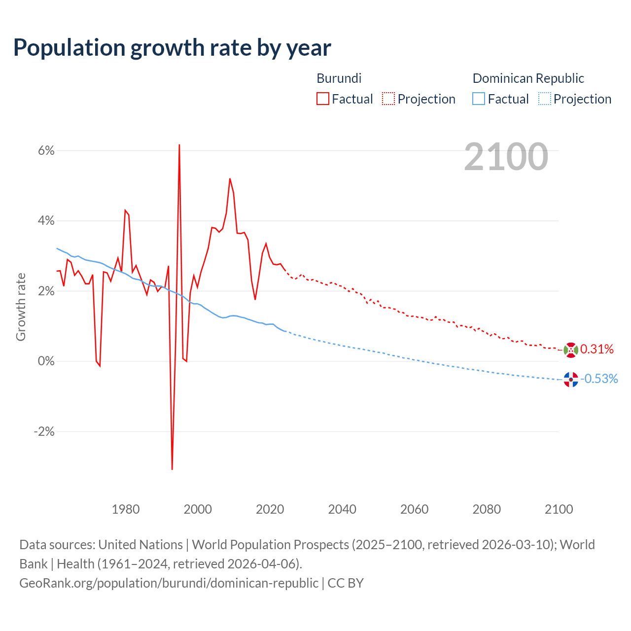 - For the last 10 years, Burundi has had an average growth rate of +2.74% per year vs +1.04% in the Dominican Republic.