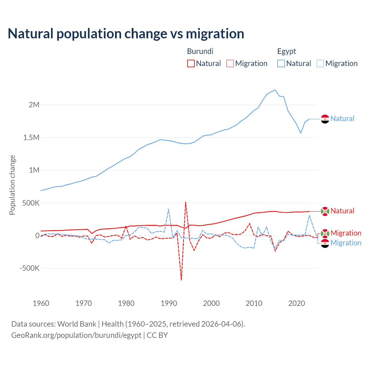 Over the last 10 years, 91% of the population change in Burundi is from natural causes (a gain of 3,614,502 people) and 9.03% is from migration (a loss of 358,928 people). In Egypt 99.6% is from natural causes (a gain of 19,180,073 people) and 0.41% is from migration (a loss of 78,975 people).