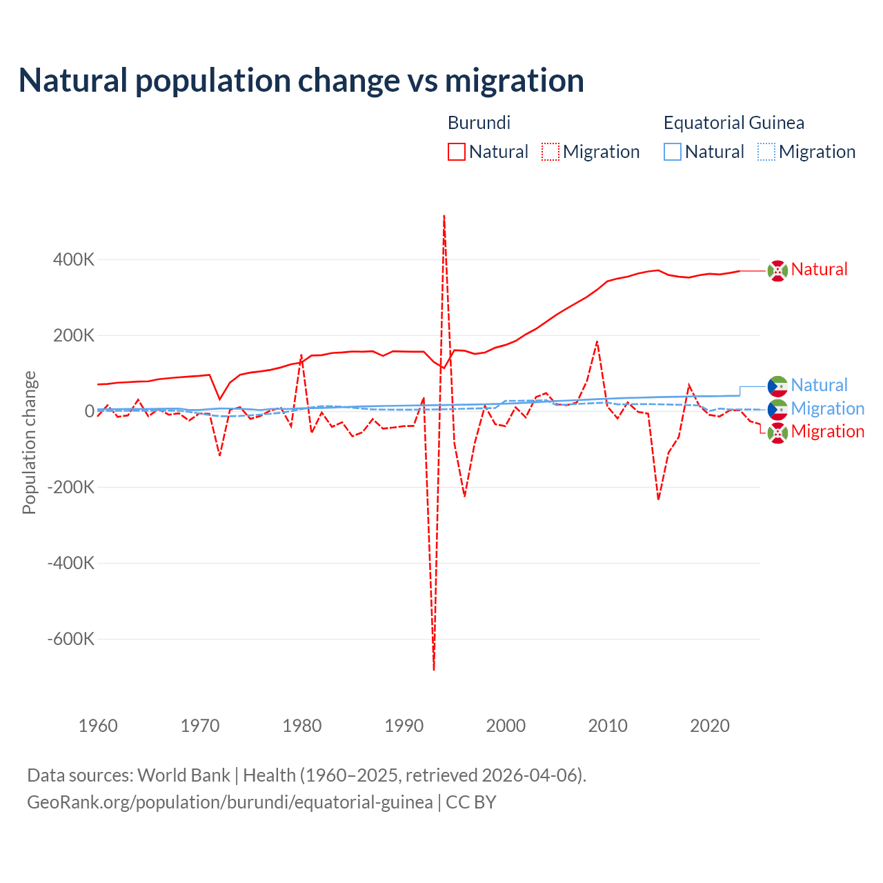 Over the last 10 years, 91% of the population change in Burundi is from natural causes (a gain of 3,614,502 people) and 9.03% is from migration (a loss of 358,928 people). In Equatorial Guinea 77% is from natural causes (a gain of 382,745 people) and 23% is from migration (a gain of 114,024 people).