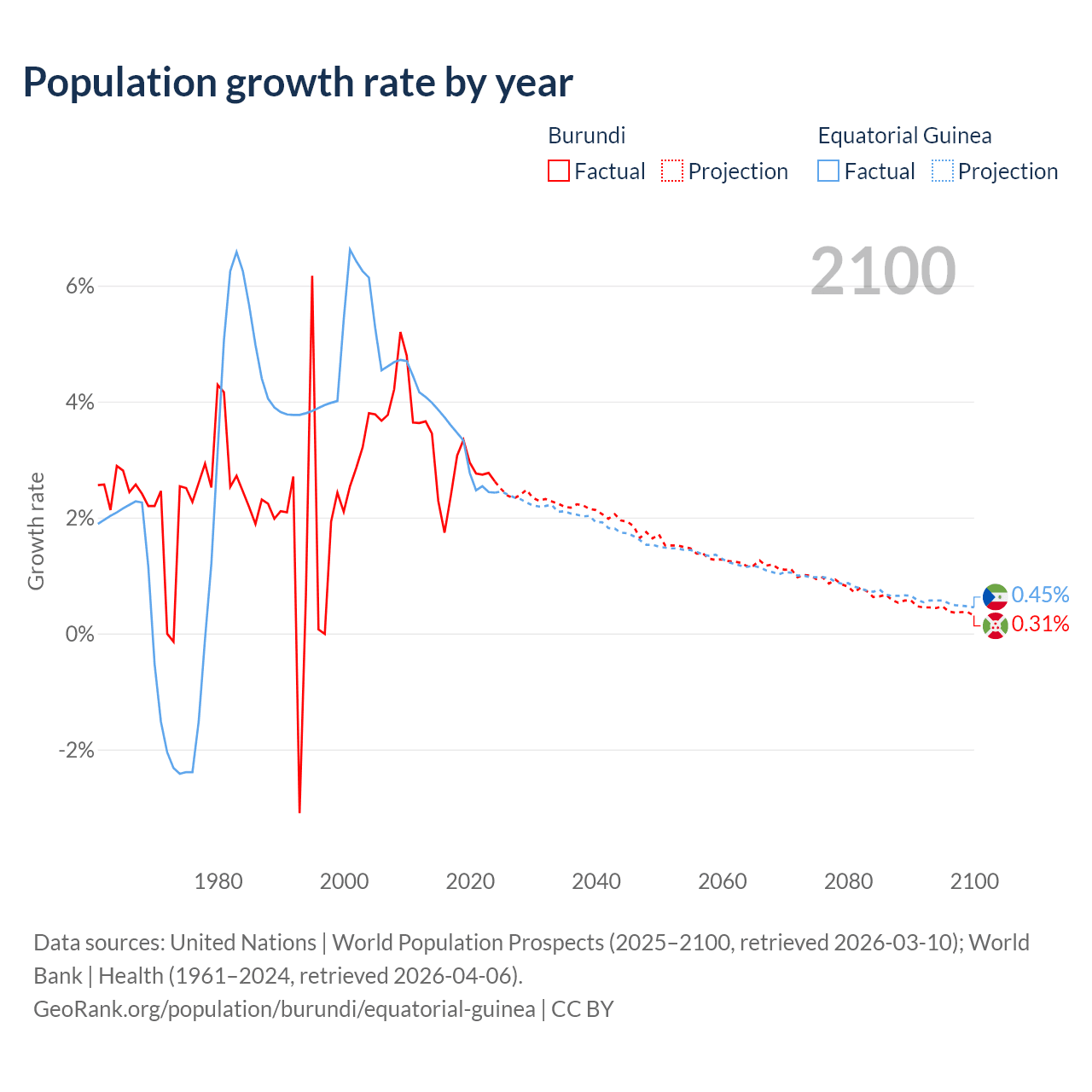 - For the last 10 years, Burundi has had an average growth rate of +2.74% per year vs +3.15% in Equatorial Guinea.