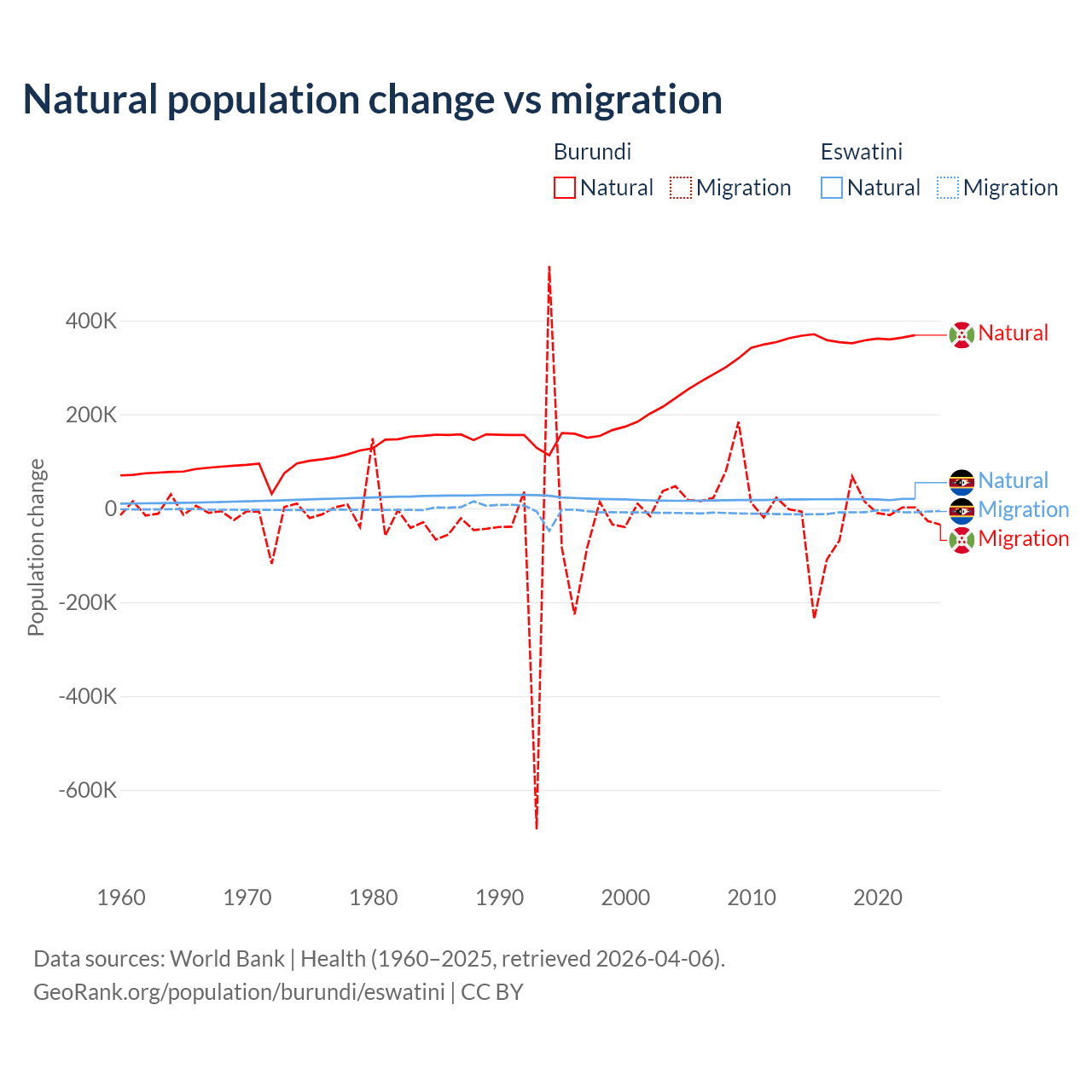 Over the last 10 years, 91% of the population change in Burundi is from natural causes (a gain of 3,614,502 people) and 9.03% is from migration (a loss of 358,928 people). In Eswatini 68.3% is from natural causes (a gain of 192,206 people) and 31.7% is from migration (a loss of 89,012 people).