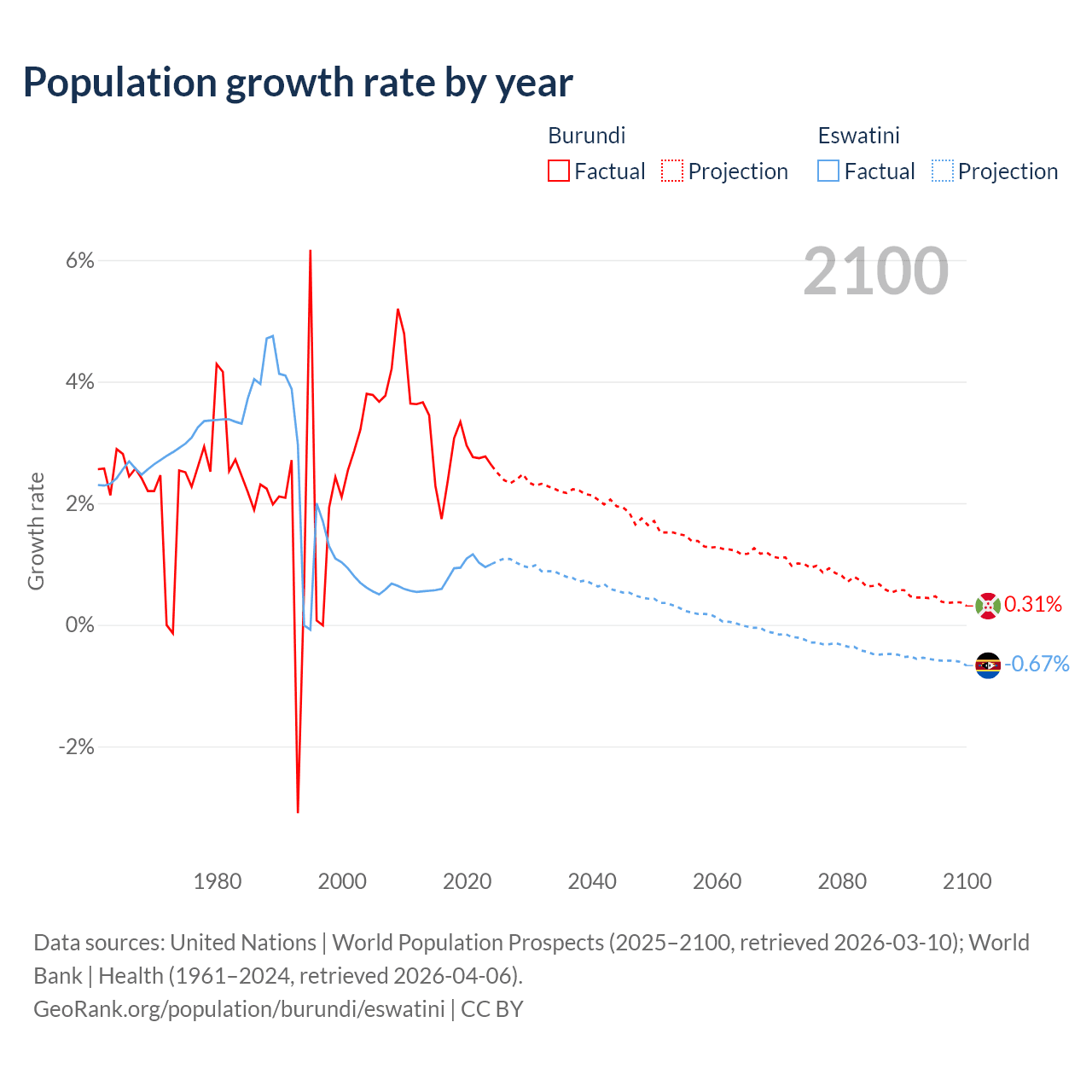 - For the last 10 years, Burundi has had an average growth rate of +2.74% per year vs +0.87% in Eswatini.